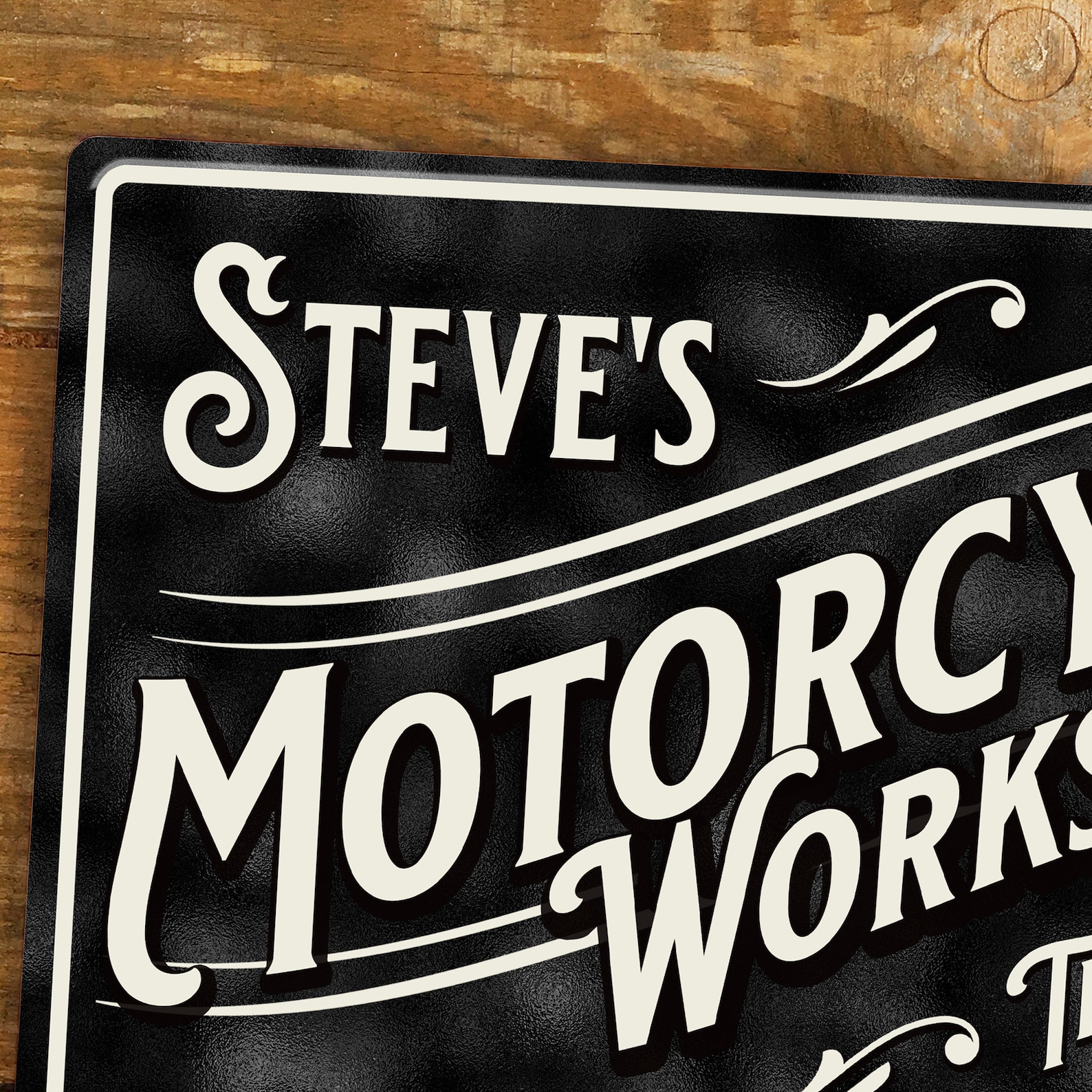 Personalised Motorcycle Workshop Sign Metal Wall Door Decor Motorbike Accessory Garage Shed Vintage Retro Tin Plaque Aluminium 200mm x 305mm