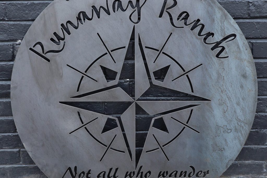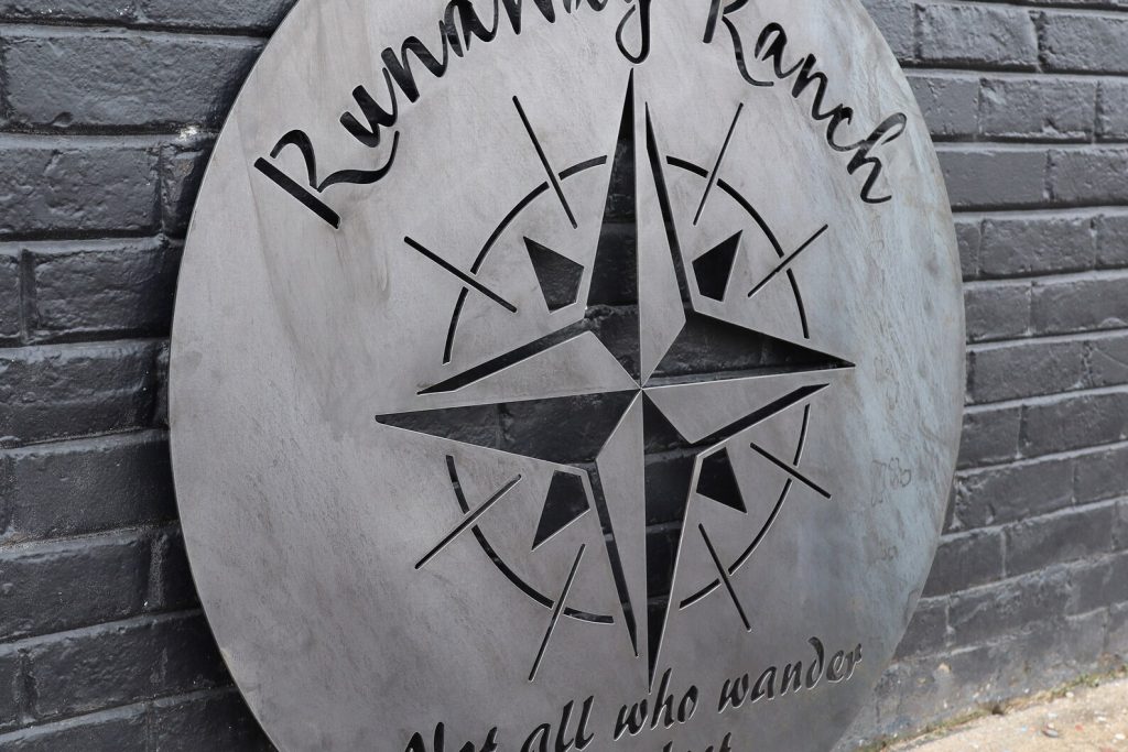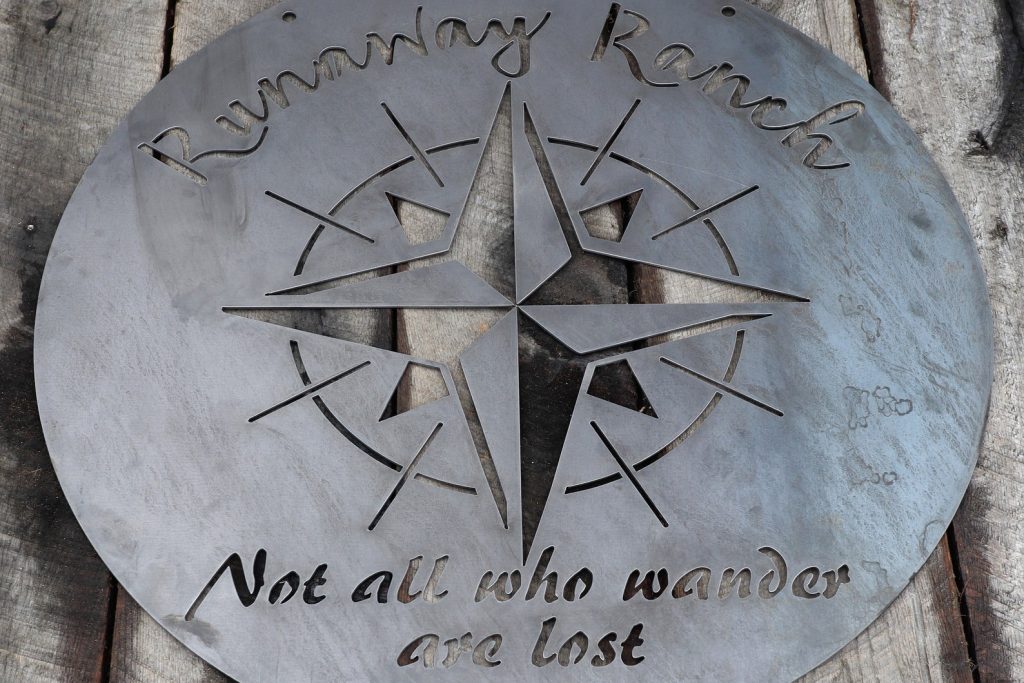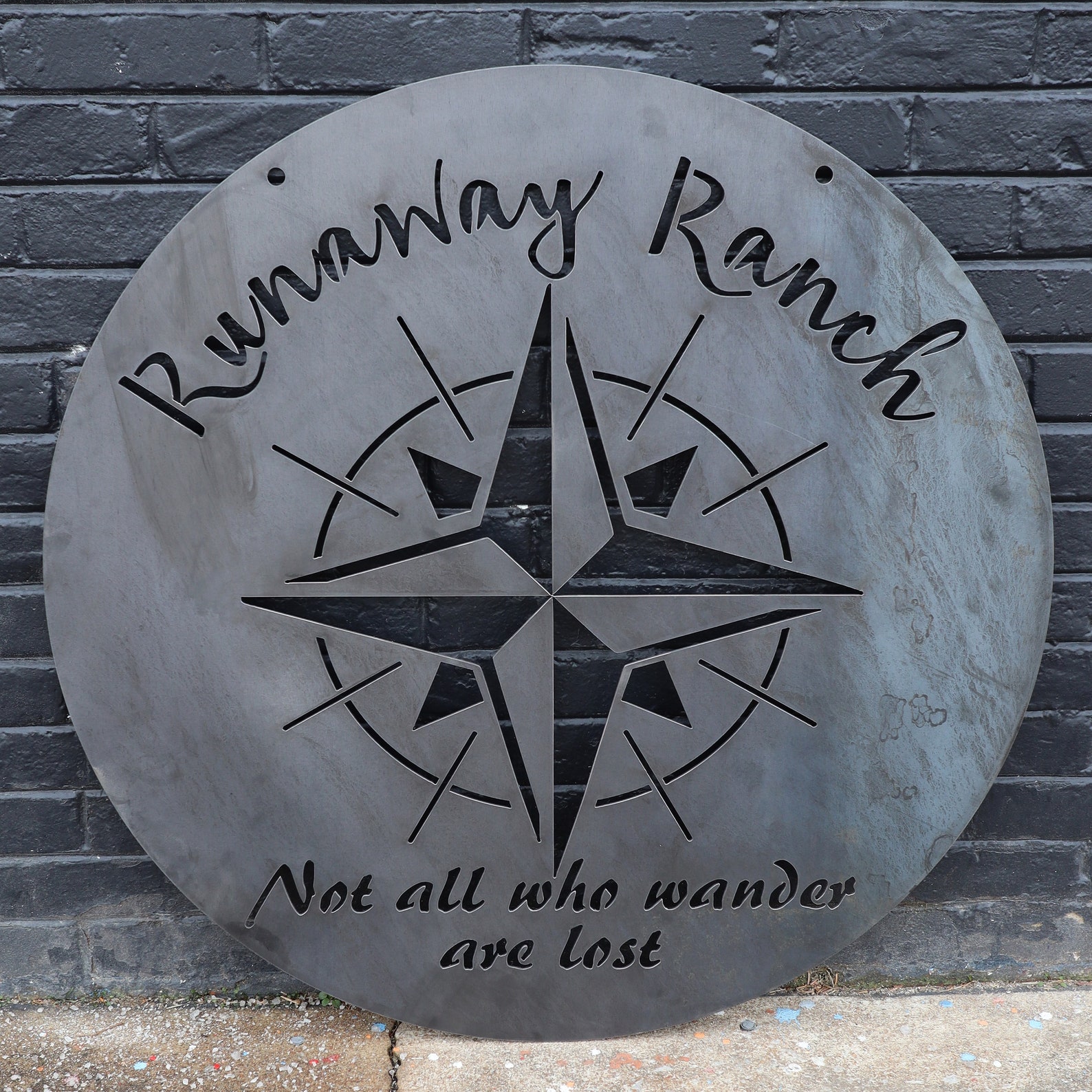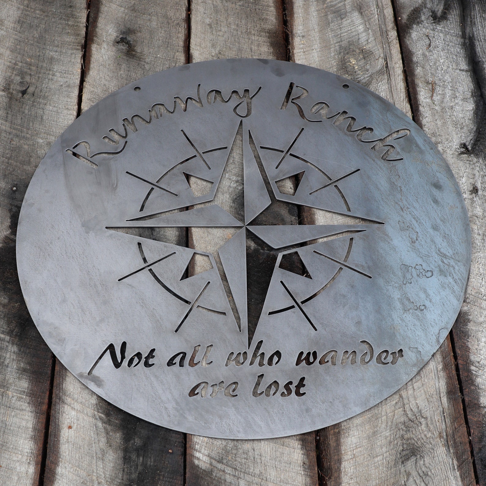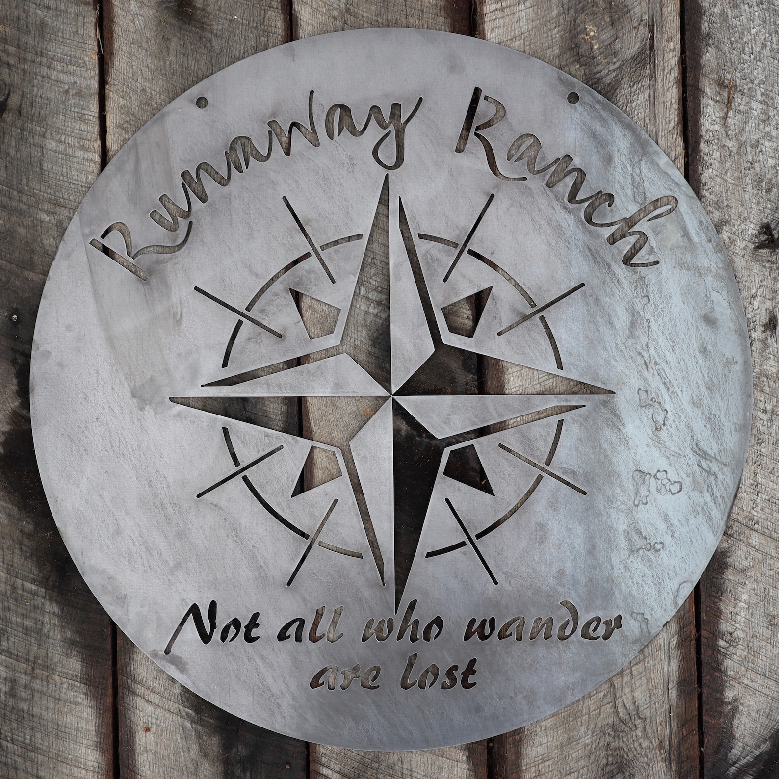 Show your love for the country life with this hanging metal ranch sign. Use this personalized metal wall art to proudly display your family or property name above a classic compass rose design. This metal rustic sign is perfect for your ranch, farm, stable, barn, or home and will let folks know that "not all who wander are lost."