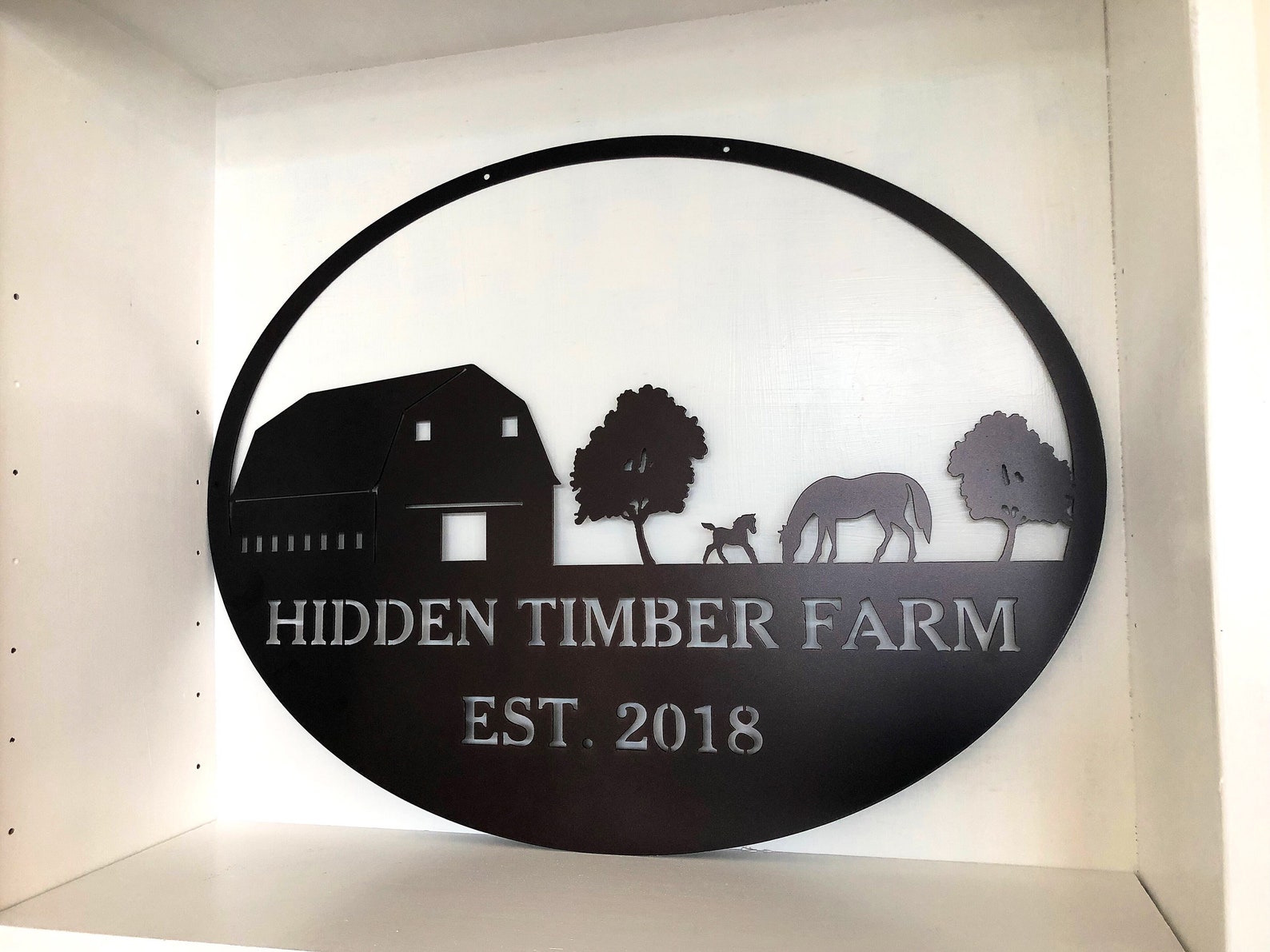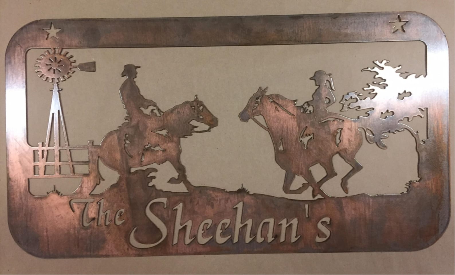 28".5" metal sign finished in rustic copper acid wash and baked on clear coat. Makes a stunning wedding gift! Or an eye catching sign for your own front entrance