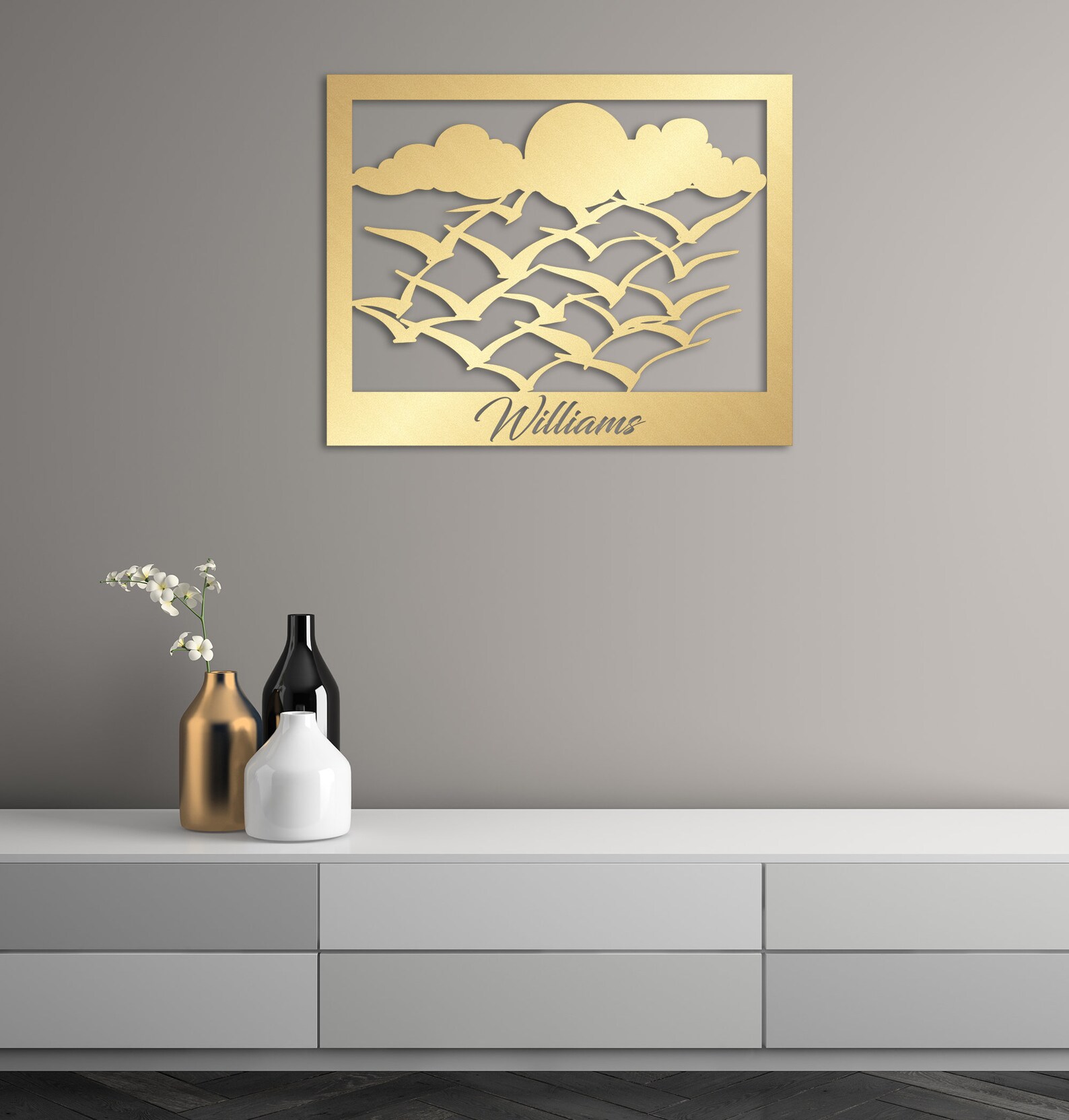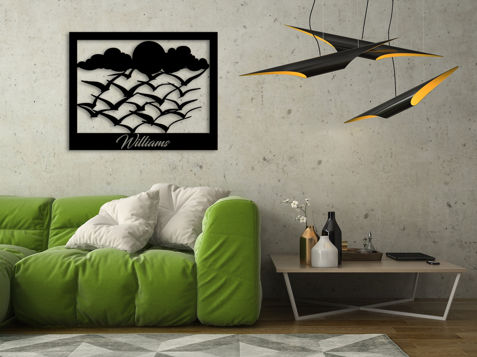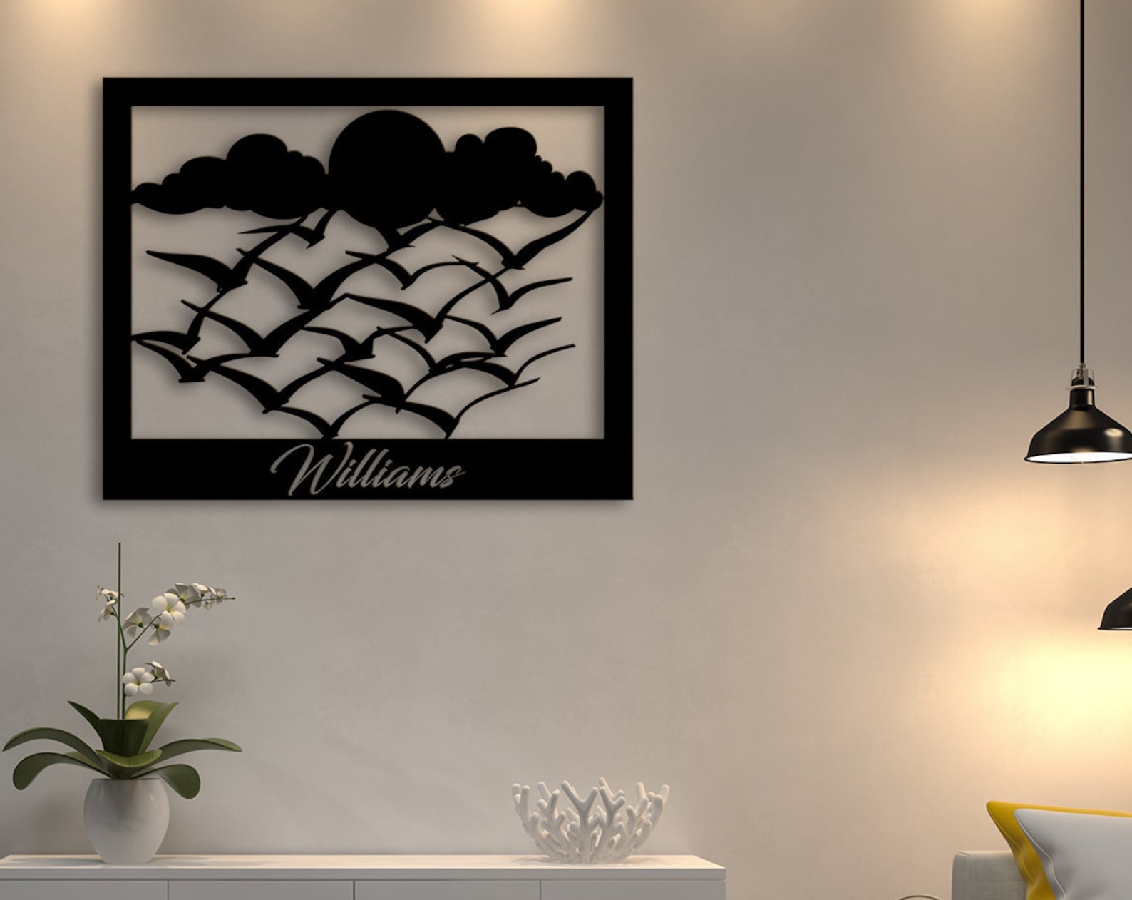 Be the first to review “Personalized Family Name Metal Wall Art – Birds & Clouds Decor”