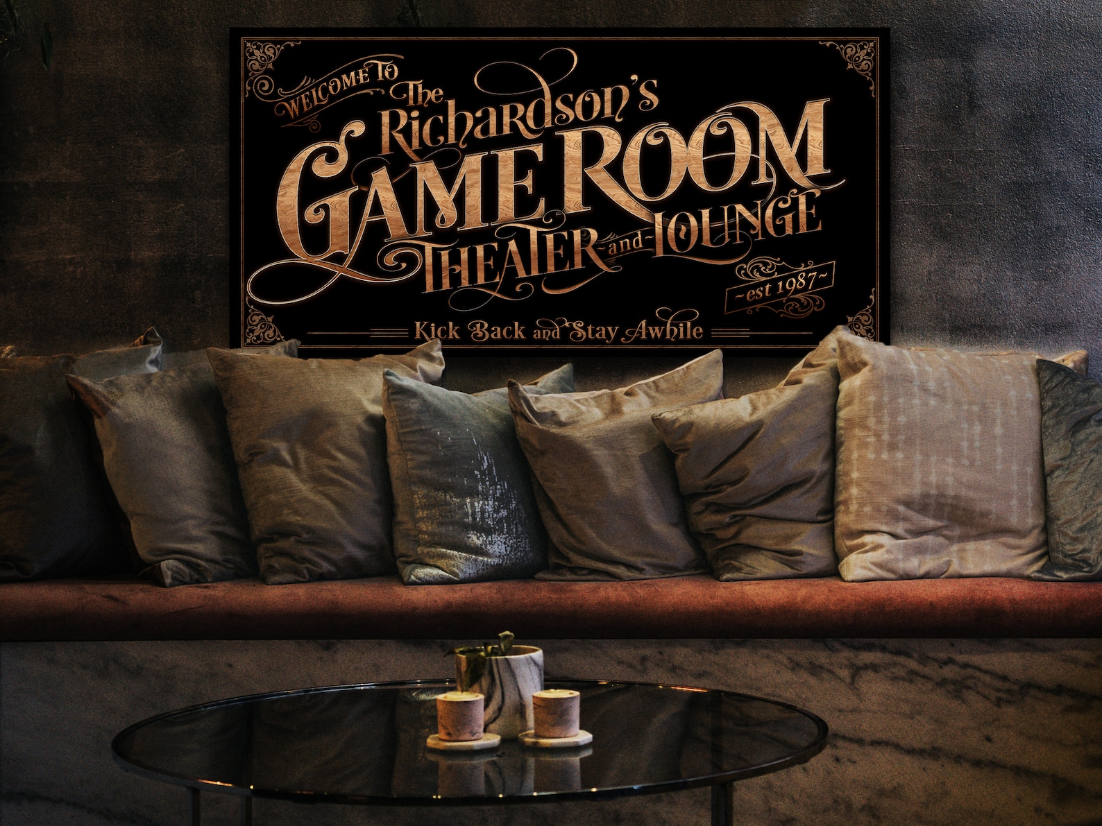 This Game Room and Home Theater Family Name sign offers a modern farmhouse look and feel. I added a wood grain overlay within the fonts and graphic elements. Display this vintage, Game Room, Theater sign and add warmth to any wall. It comes in your choice of metal or canvas!