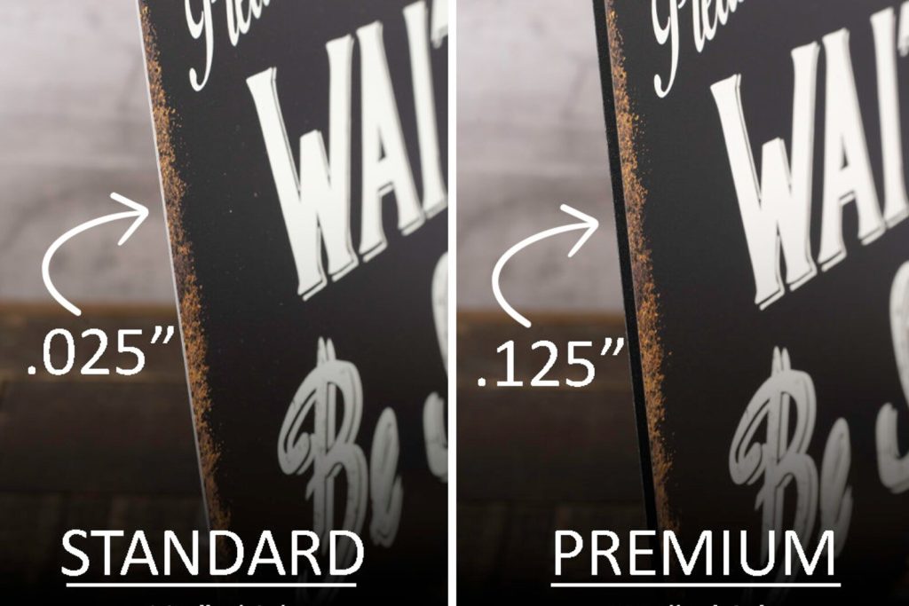 -PREMIUM options are crafted from 100% recycled Aluminum Composite panels that are .125" thick. Aluminum composite panel is comprised of a reinforced synthetic core sandwiched between two sheets of aluminum. The benefits of this material is that it9;s more rigid yet lightweight making it easy to hang and it9;s 100% recycled.