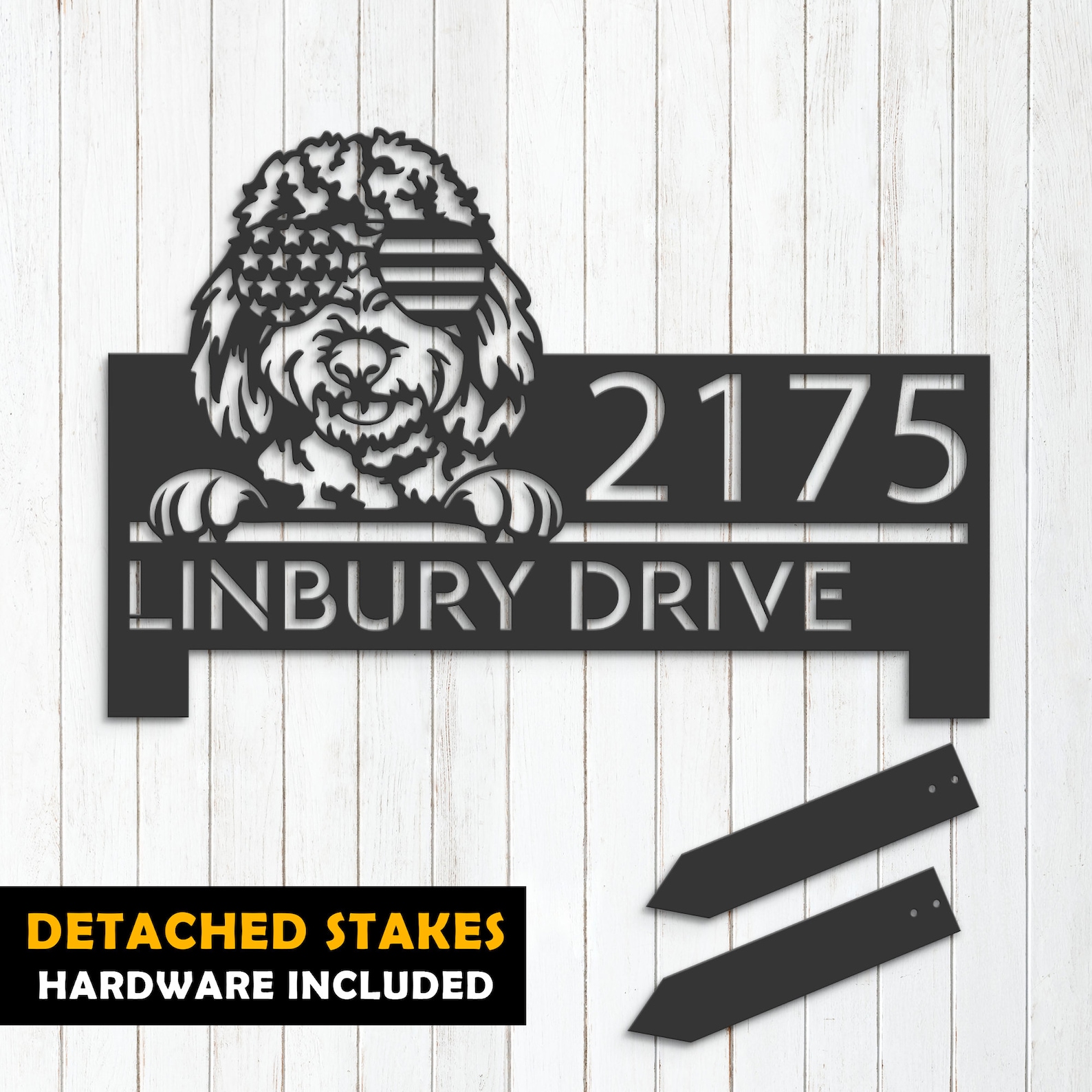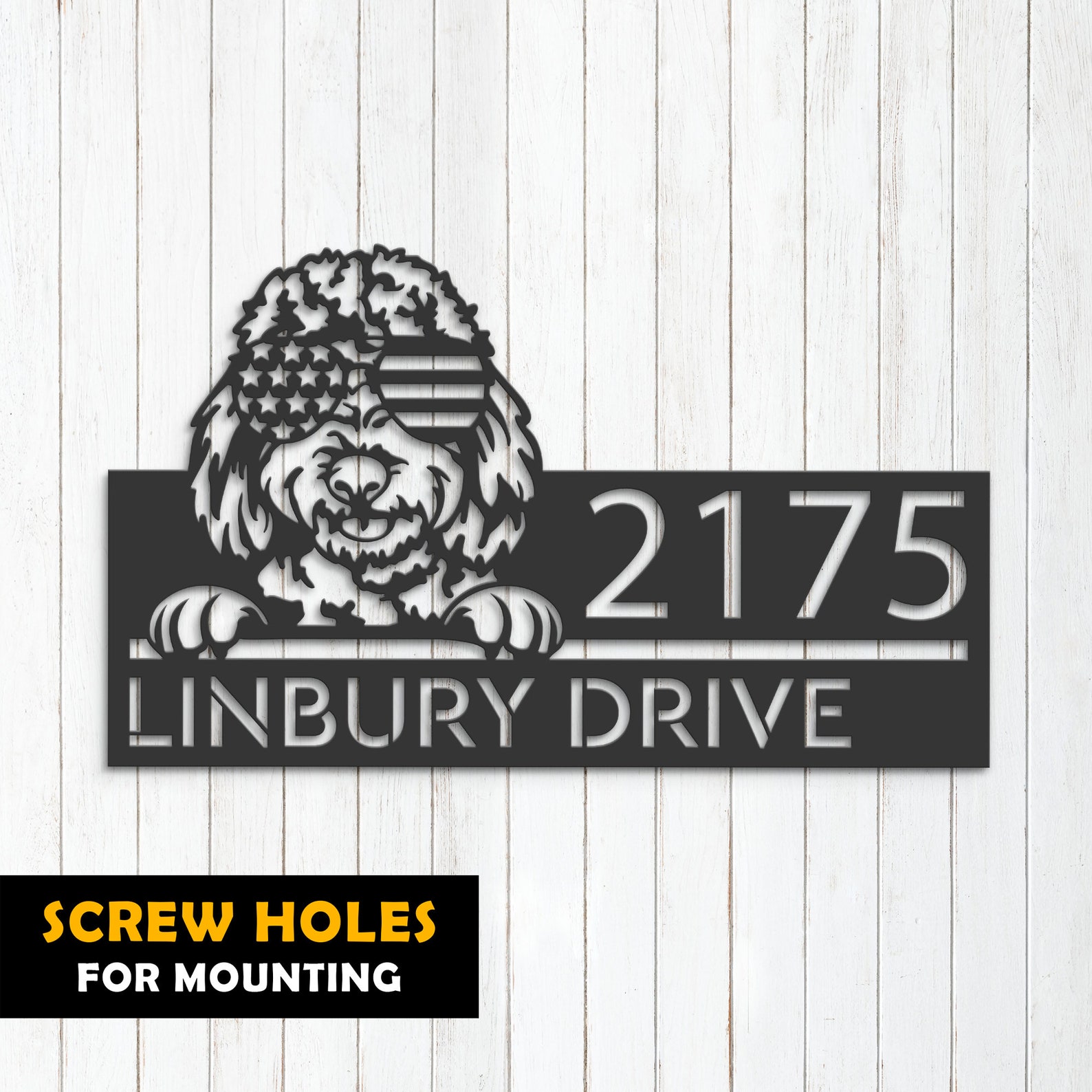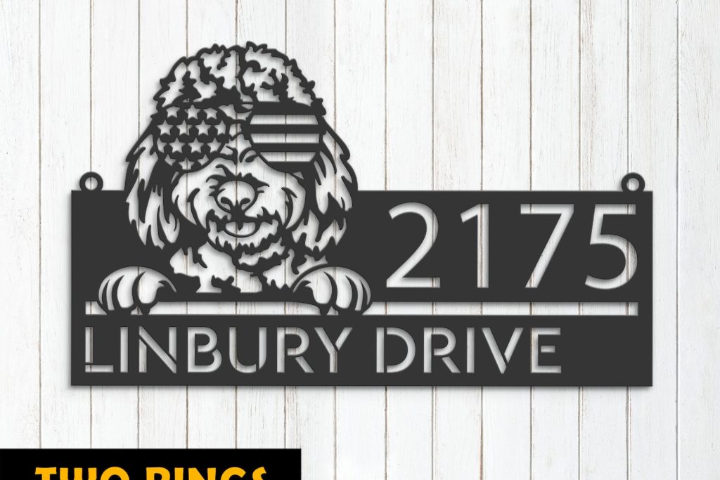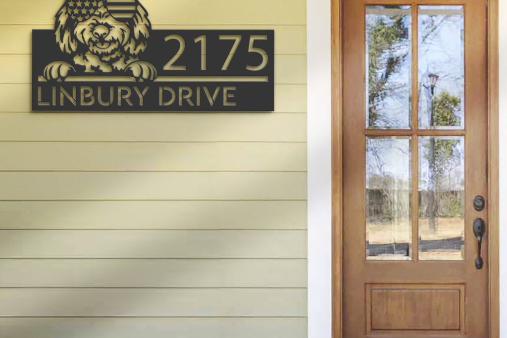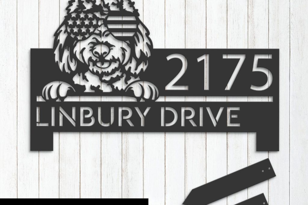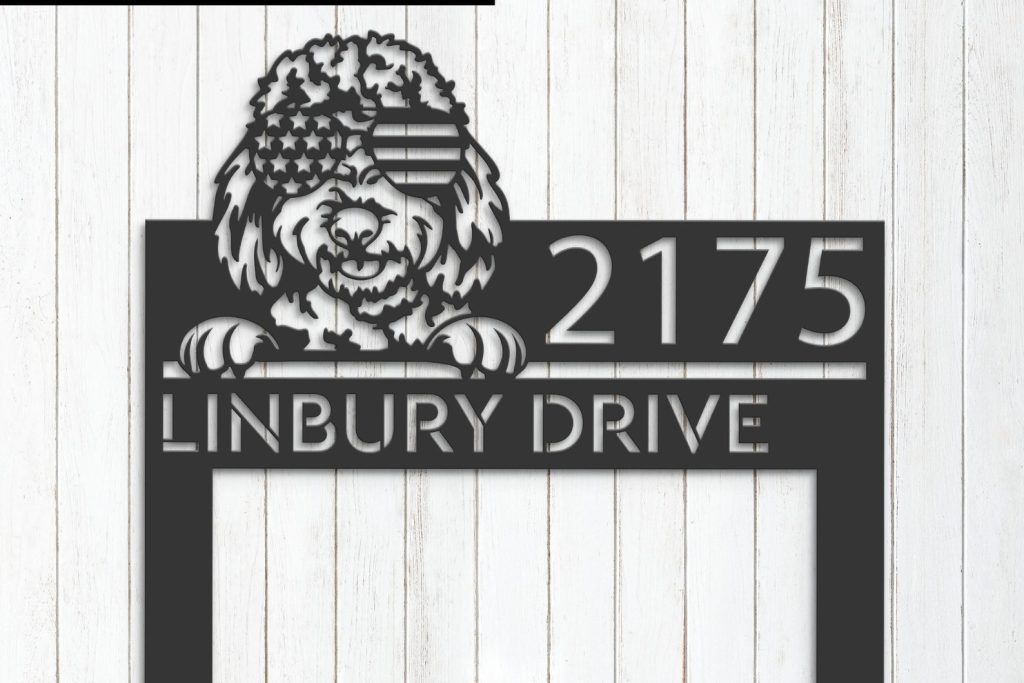 Personalized Goldendoodle Dog Metal Address Sign – US Flag Glasses