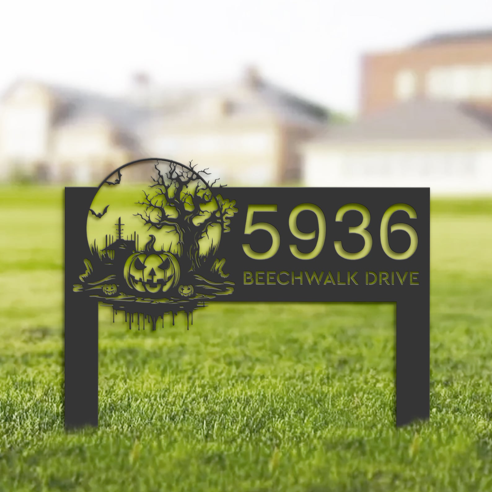 Personalized Halloween Pumpkin Metal Address Sign – Haunted Scene Plaque