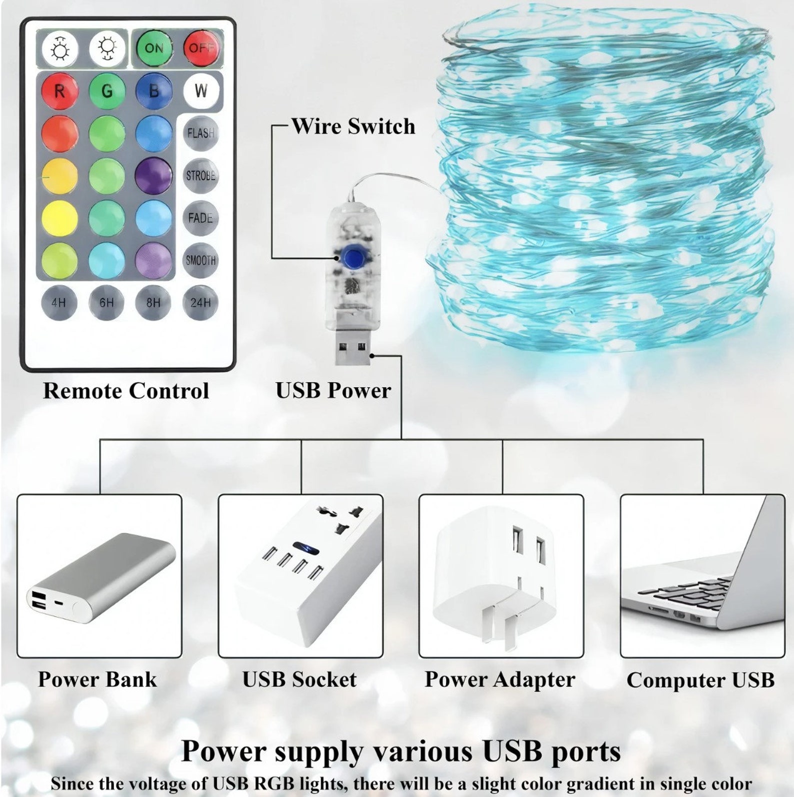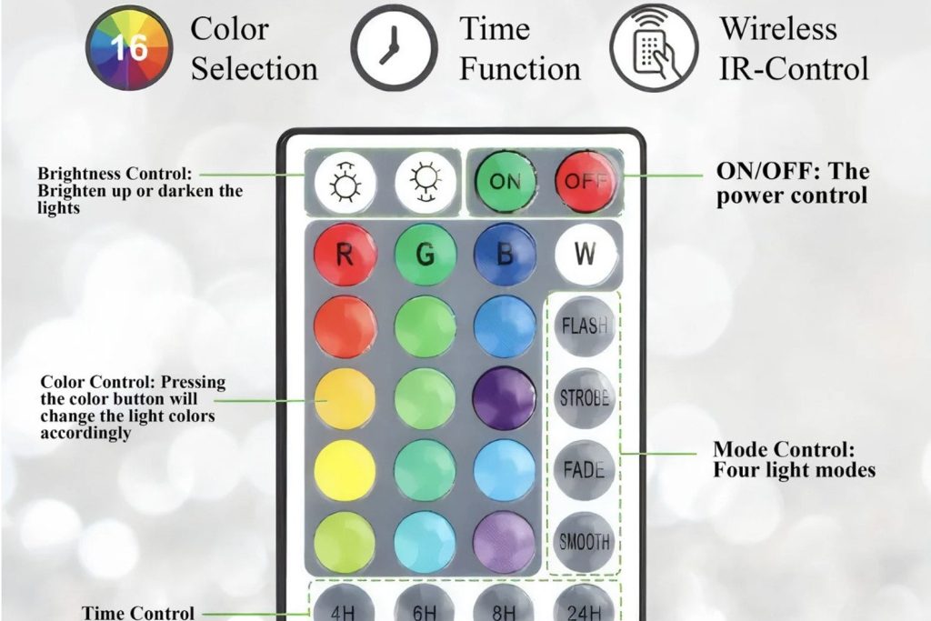 – Remote control: You can use the remote to turn the lights on and off, change the color to one of 12 vibrant colors, adjust brightness, cycle through the colors, and set a timer. The remote is battery-operated, we do not provide built-in batteries for the remote.