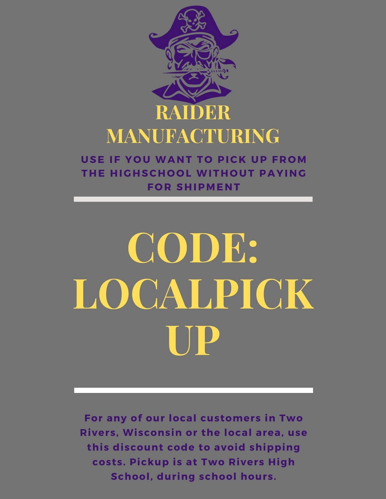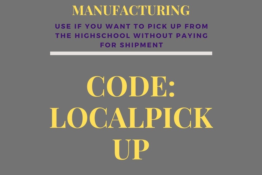 Enter the coupon code LOCALPICKUP during checkout if you wish to pickup from the high school.