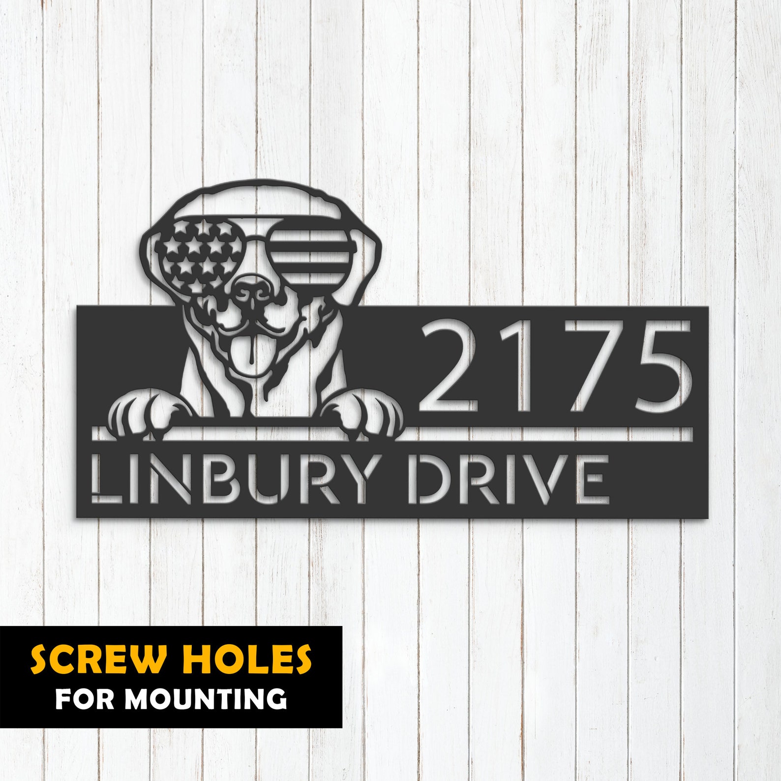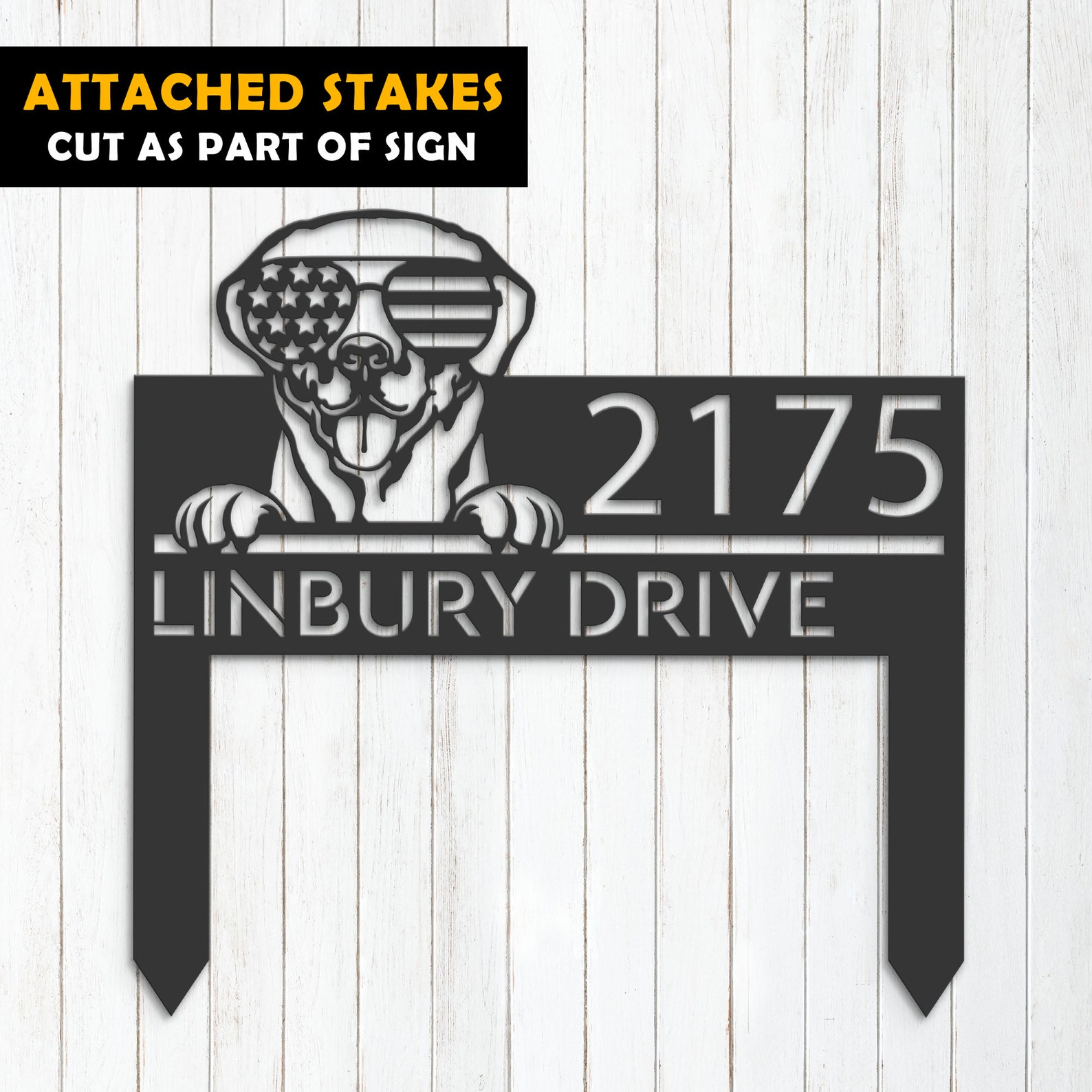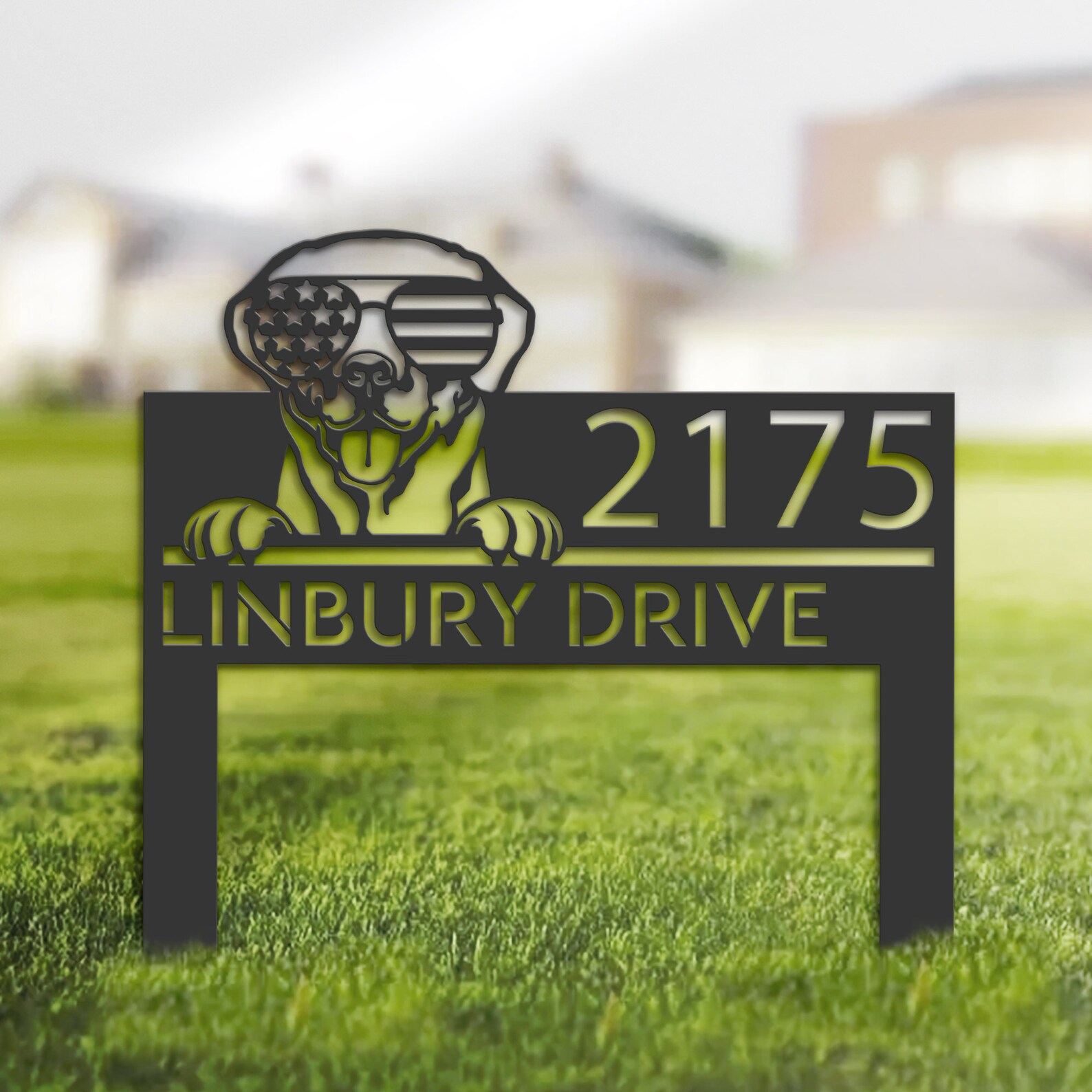 Be the first to review “Personalized Labrador Metal Address Sign – US Flag Glasses”