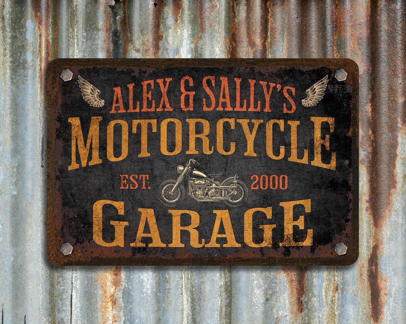 Personalized Metal Motorcycle Garage Sign | Great Gift for Bikers | Customize this sign with your first name and an Established Date. Designed with an extreme weathered Black and Orange rusty look. For that person who lives to ride!
