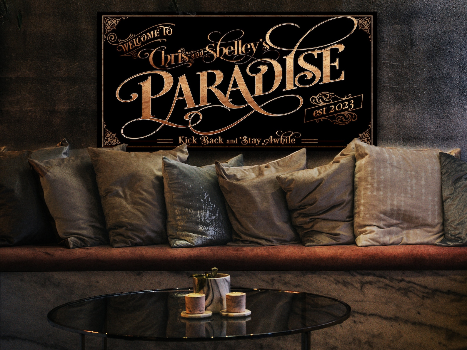 This Paradise Family Name sign offers a modern farmhouse look and feel. Display this vintage, wood paradise sign anywhere in your home or on the porch. It comes in your choice of metal or canvas!
