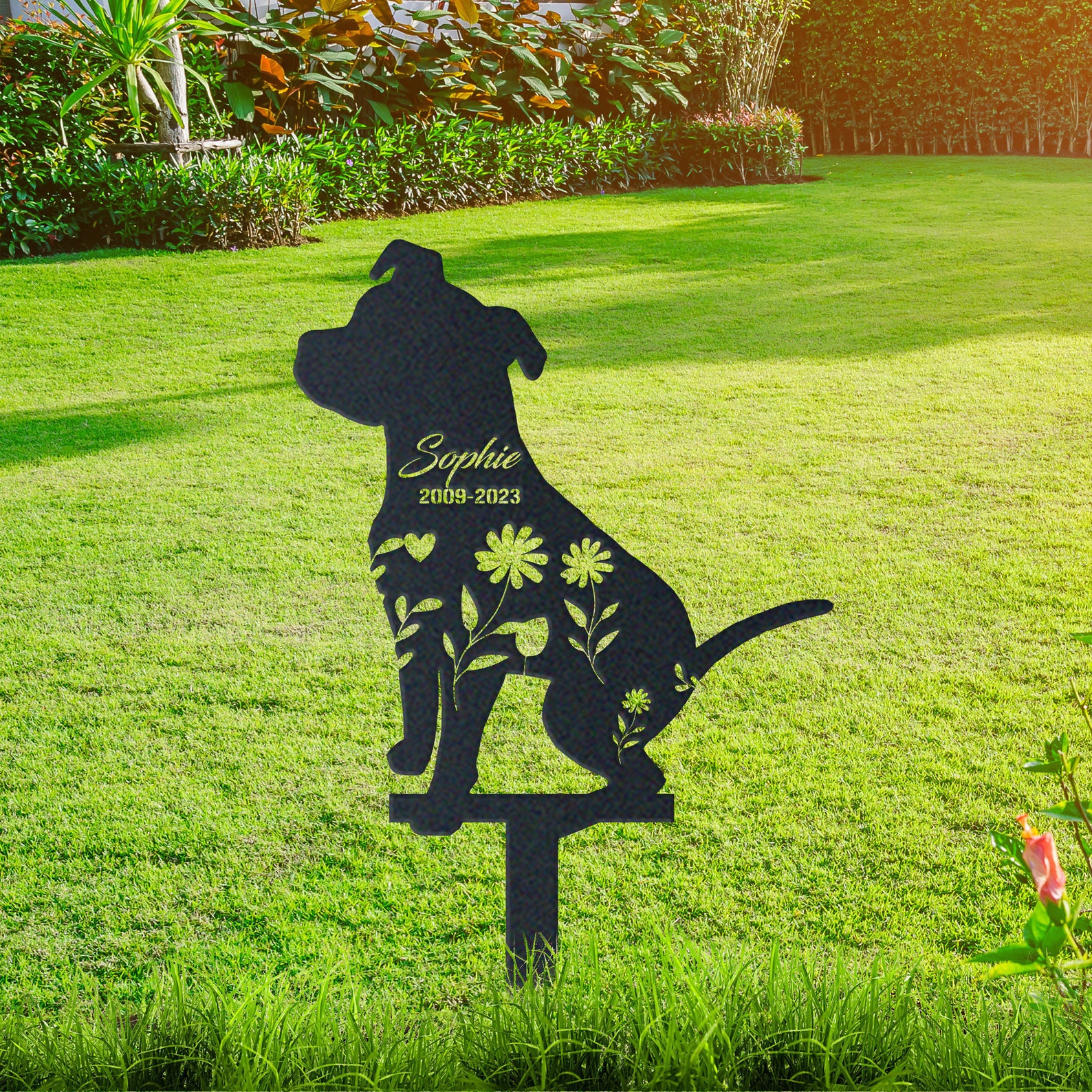 The stake features a unique design with Pit Bull silhouette, a name of your choosing, and date for you to add a special memento. It is made from a sturdy steel with powder coated.