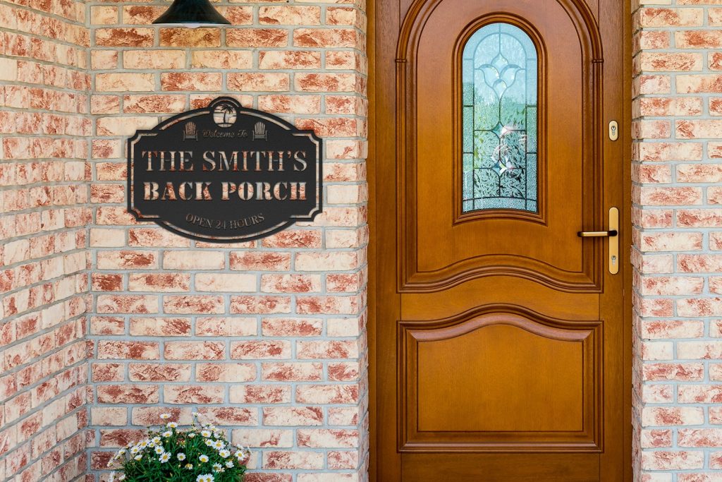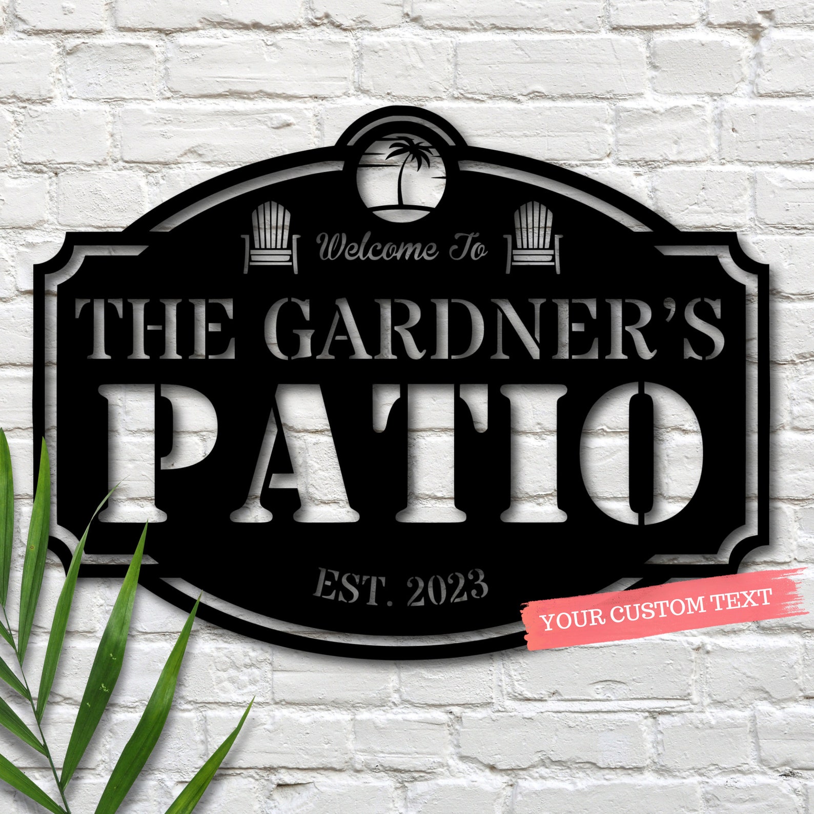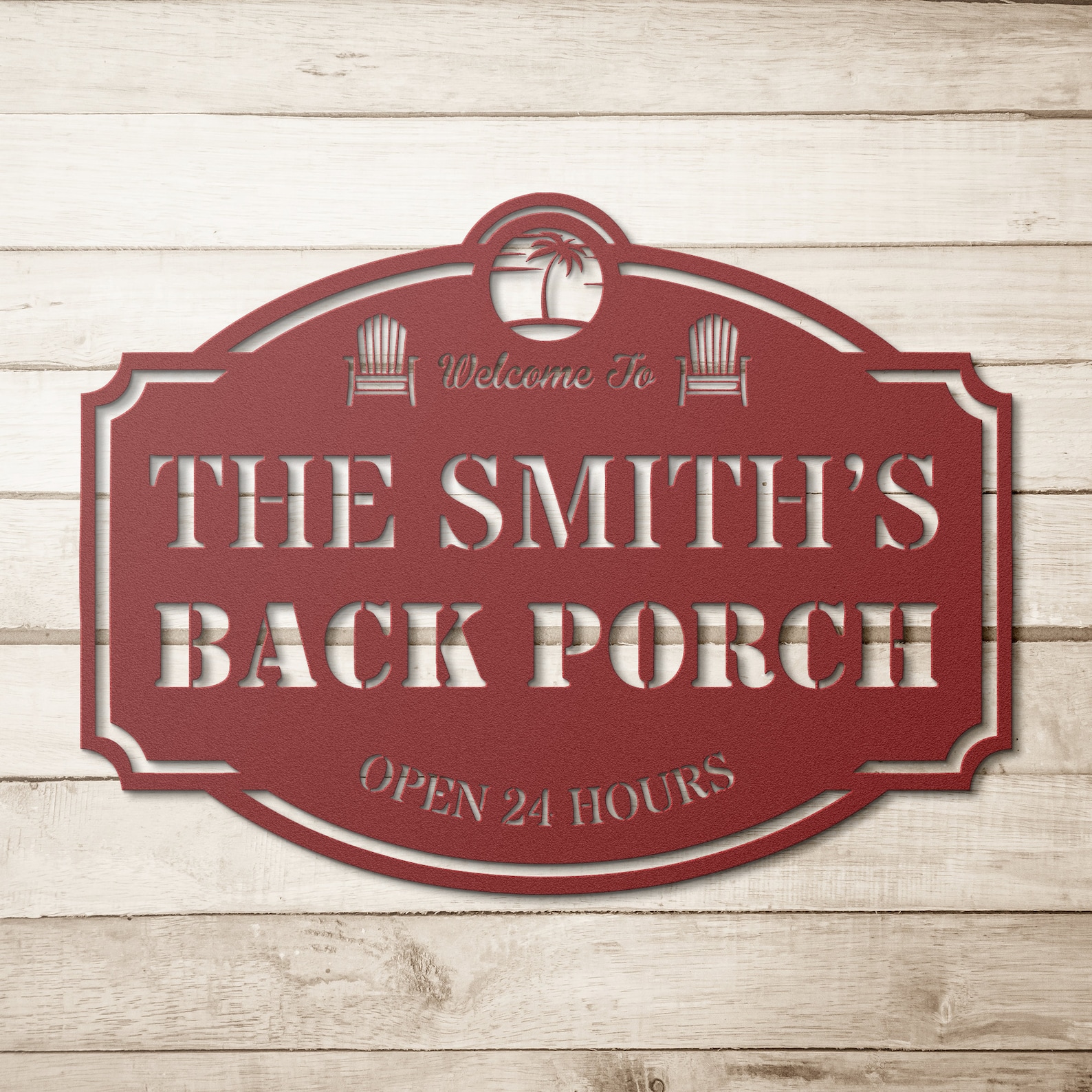 Add a touch of personalization to your outdoor oasis with our custom metal patio sign. This beautiful sign features your family name in elegant lettering, framed by two inviting patio chairs and lush palm trees at the top. Welcome guests to your own tropical paradise with this unique and stylish addition to your outdoor decor.