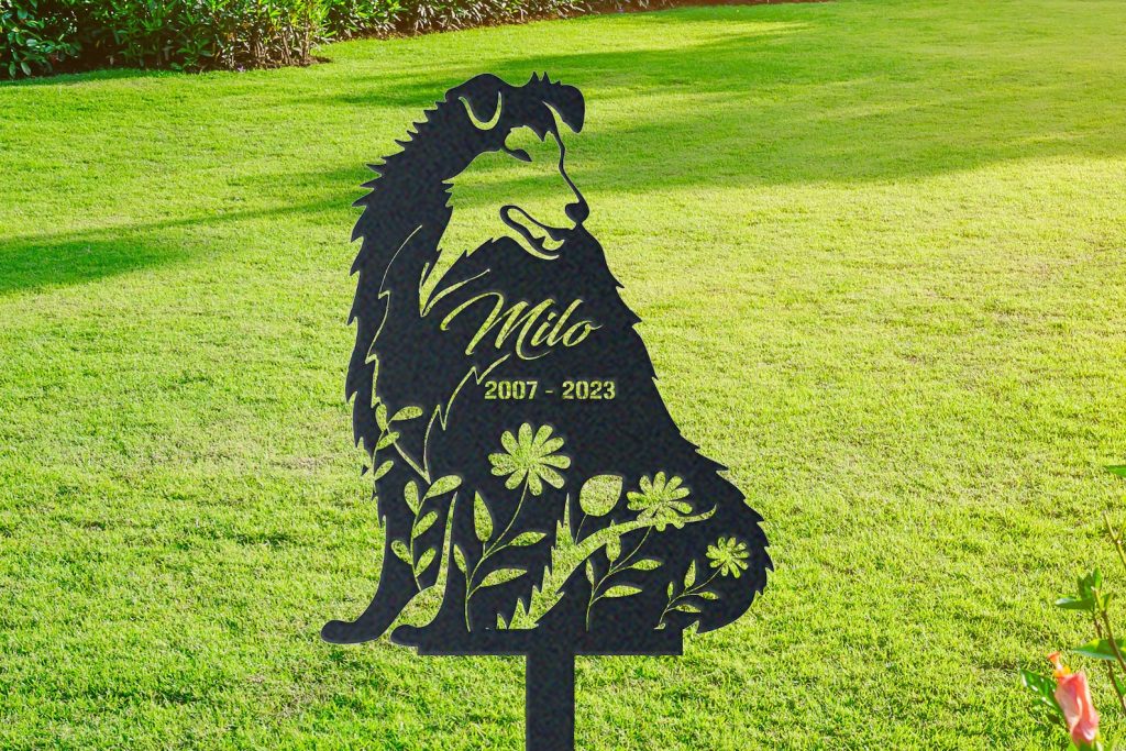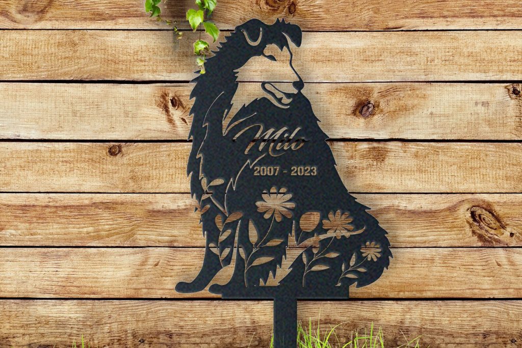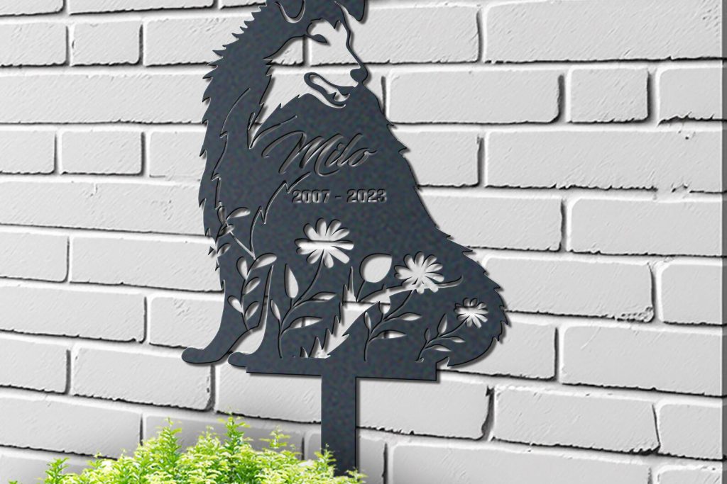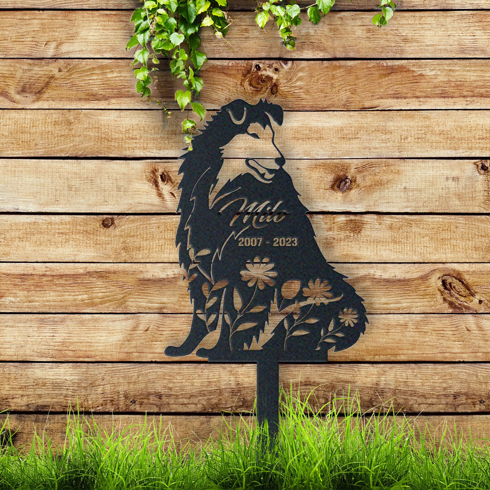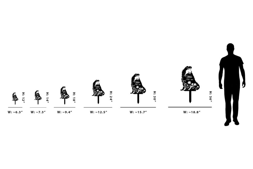 The stake features a unique design with Rough Collie silhouette, a name of your choosing, and date for you to add a special memento. It is made from a sturdy steel with powder coated.
