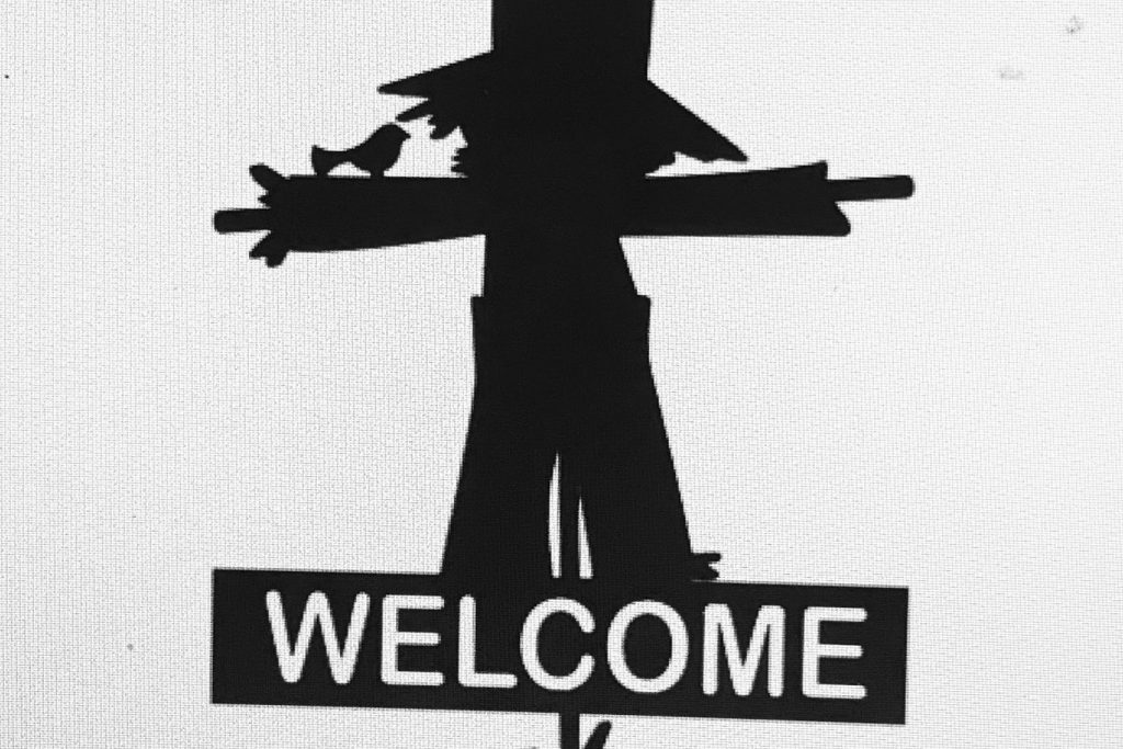 Personalized, metal hanging sign or yard stake featuring a scarecrow with YOUR personalization!