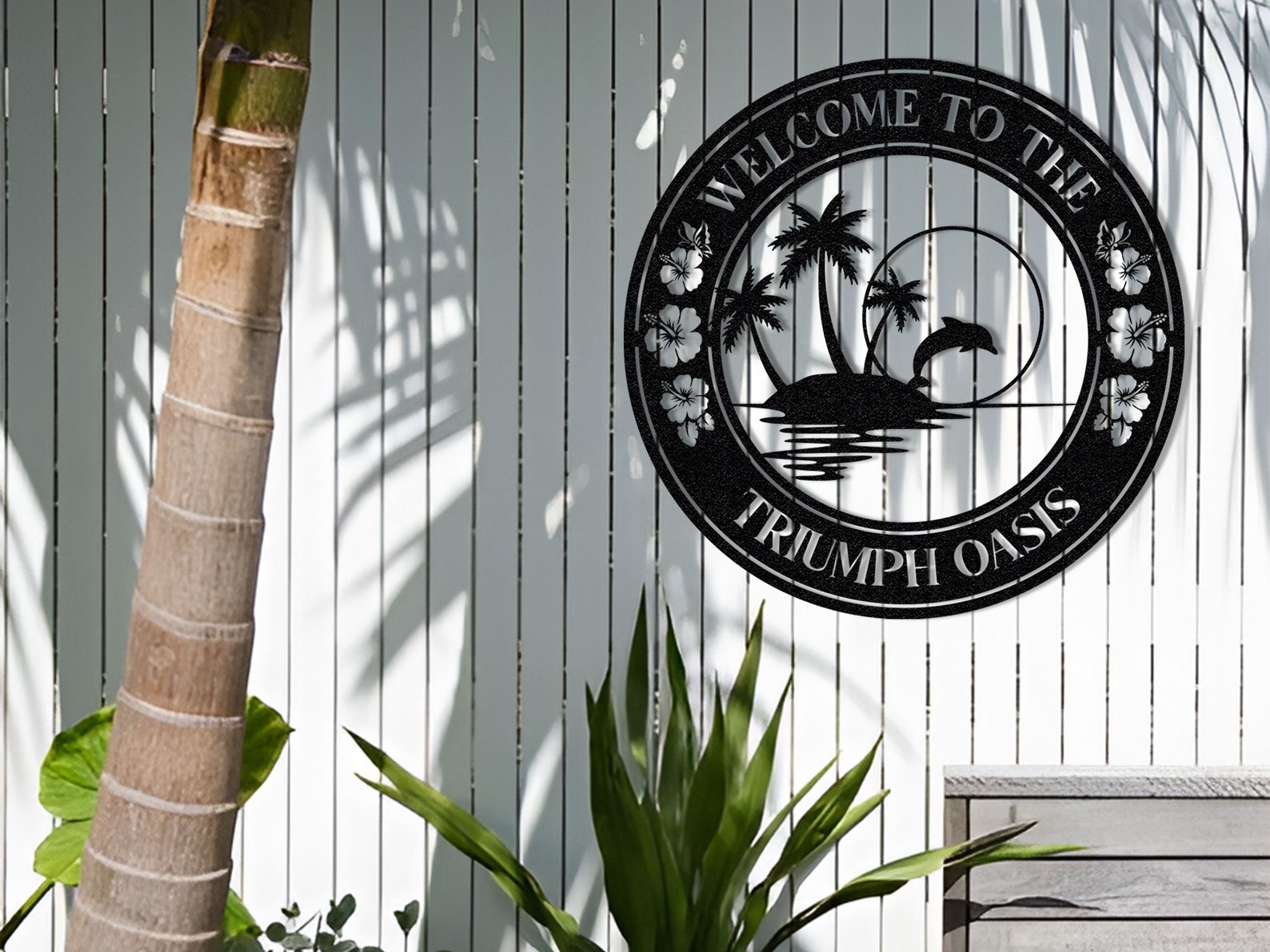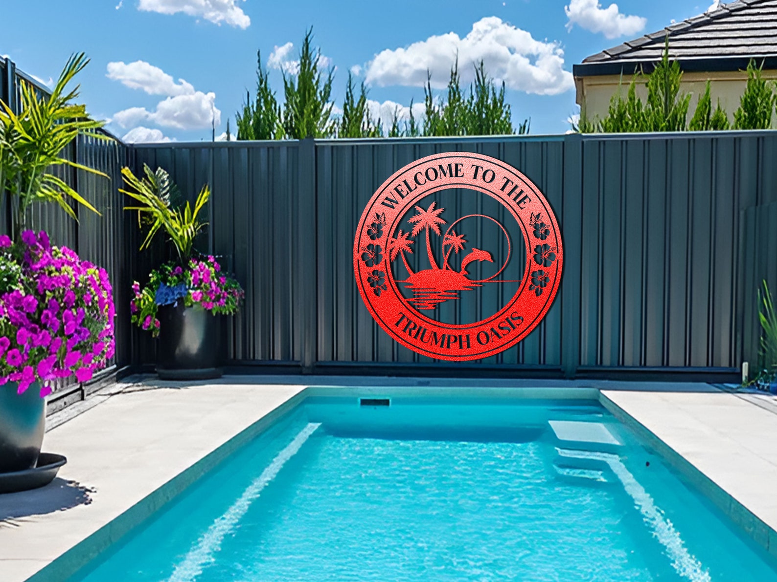 Personalised Tropical Patio Metal Sign, Custom Backyard Pool Sign, Family Welcome Sign, Palm Tree Decor, Outdoor Patio Sign, Oasis Sign
