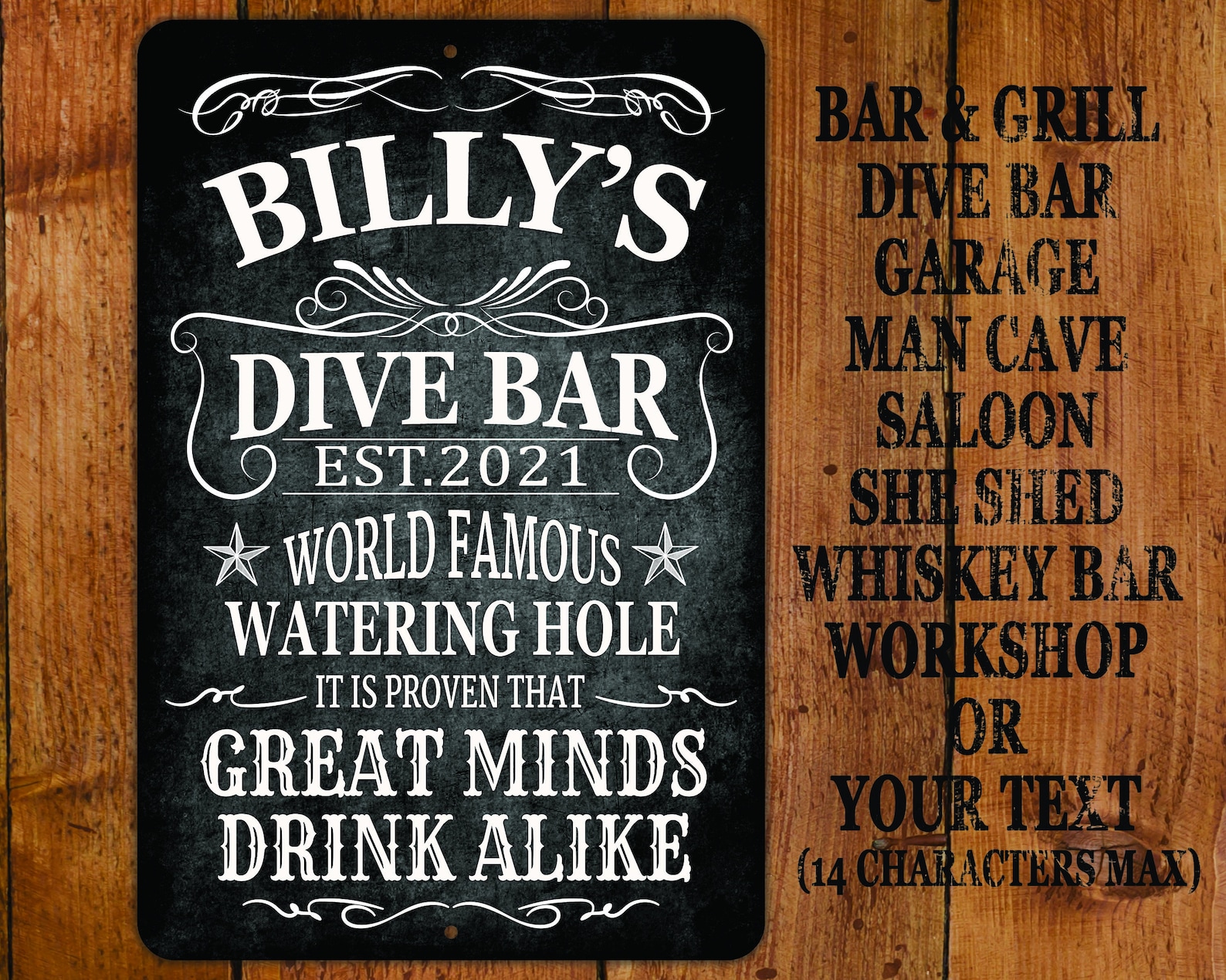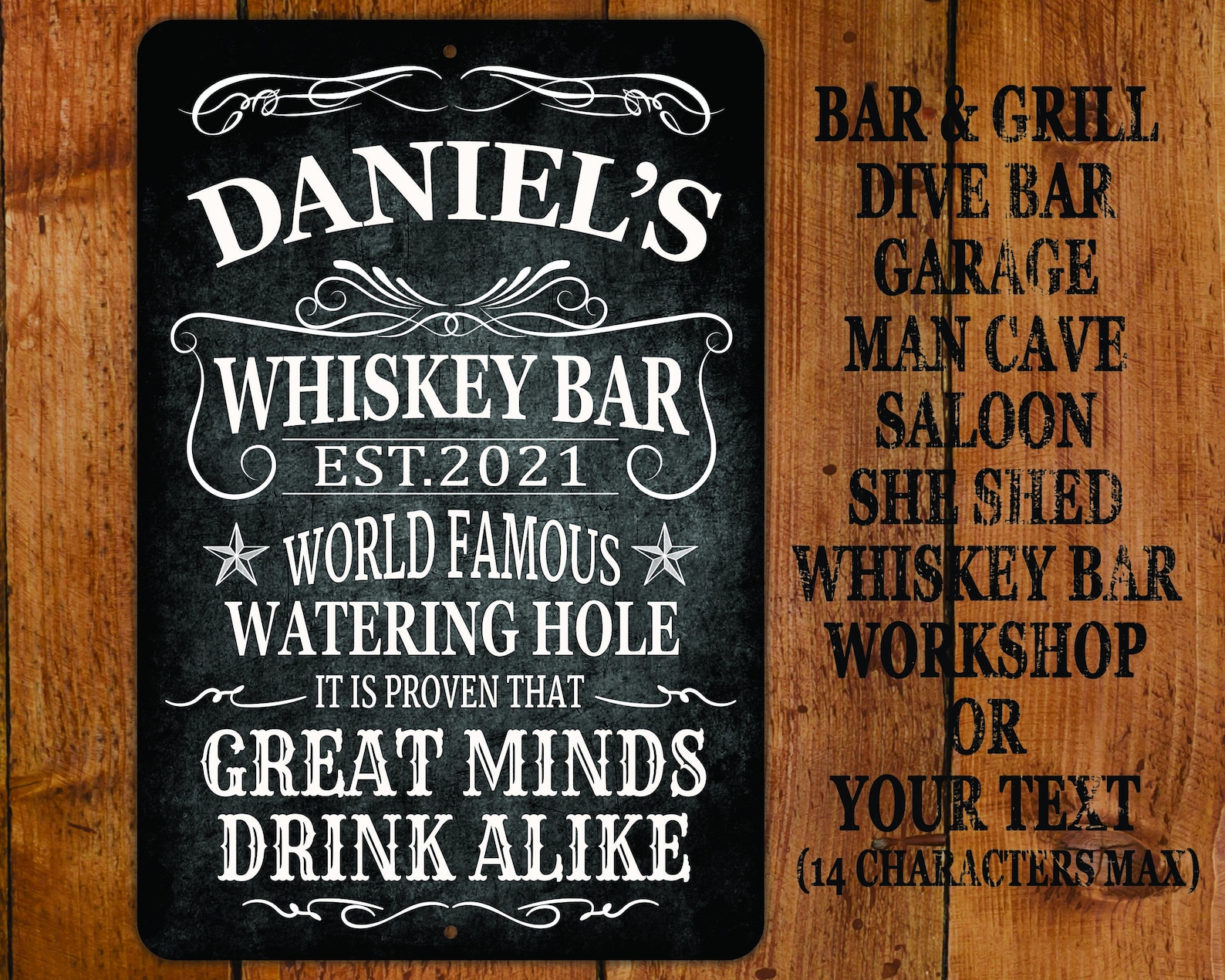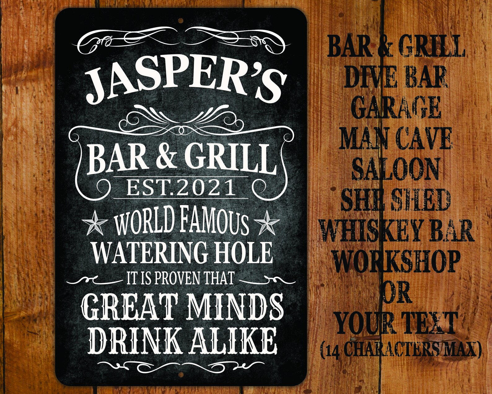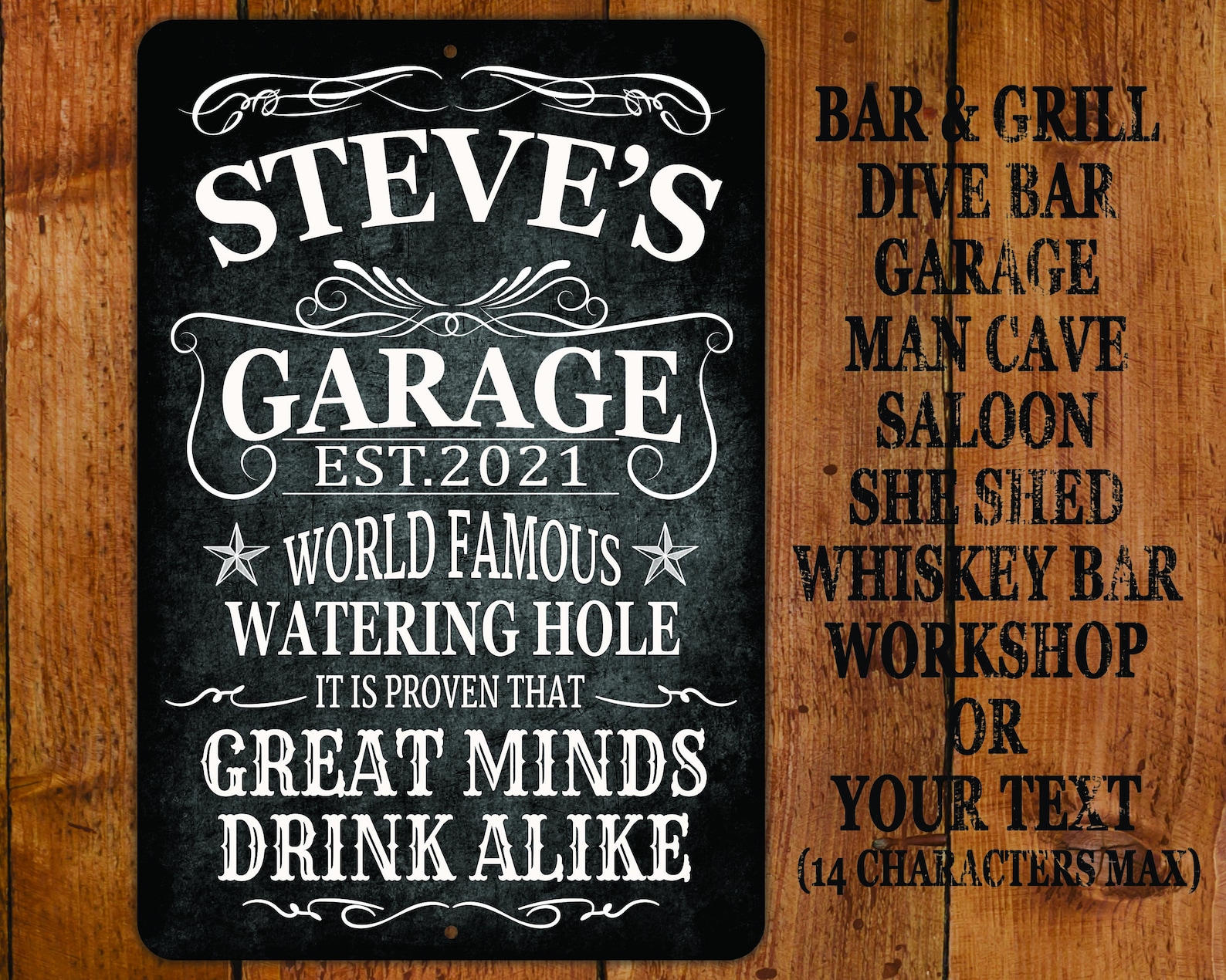 Personalized Black Vintage Style Metal Bar Sign | Great Gift | Customize this sign with your first name, last name or whatever bar name you want. First pick a location–you can use one of our choices or provide your own! Man Cave, Home Bar, Pub, Garage, Tavern, Workshop, She Shack, Game Room or your favorite getaway retreat | Designed with a weathered, antiqued look that will make your special place all yours!