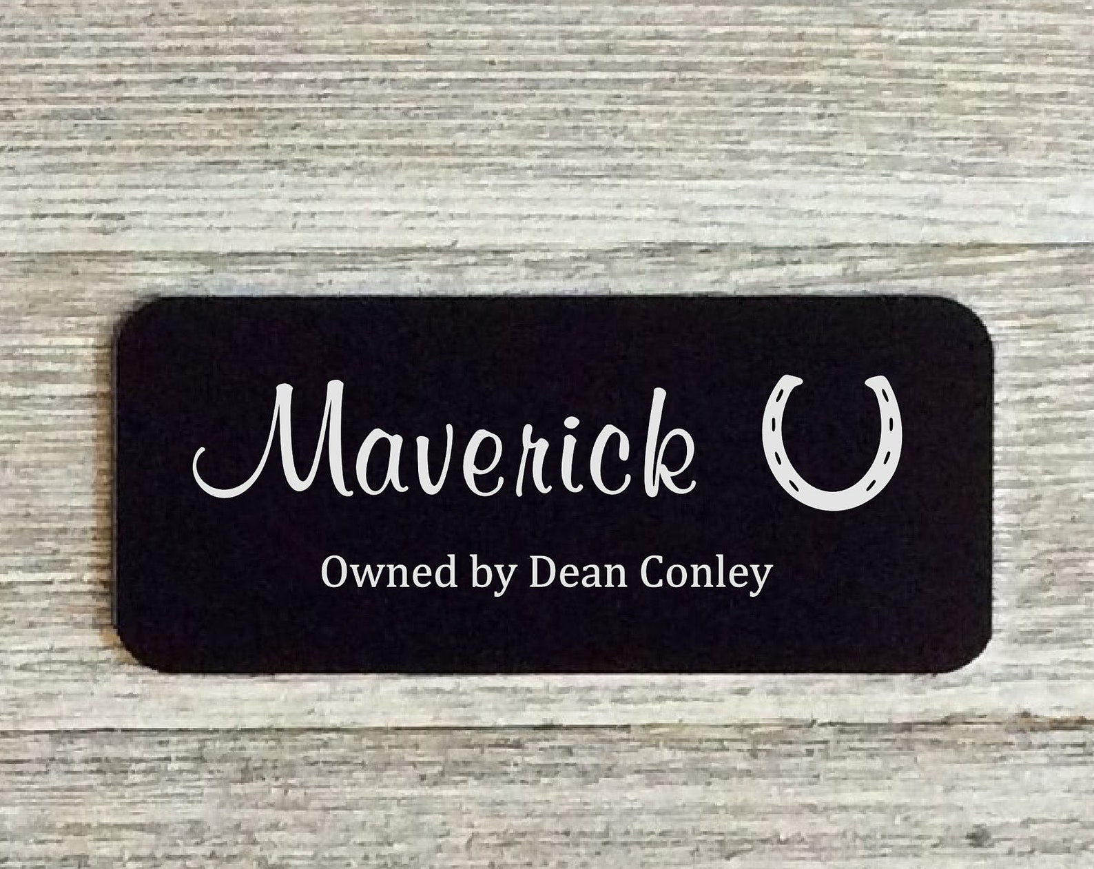 Engraved metal pet name plate. 8" x 3" – Plates comes black with silver letters. Great for Stalls, Barns, Kennels and most any outdoor installation. Made for outdoor use.