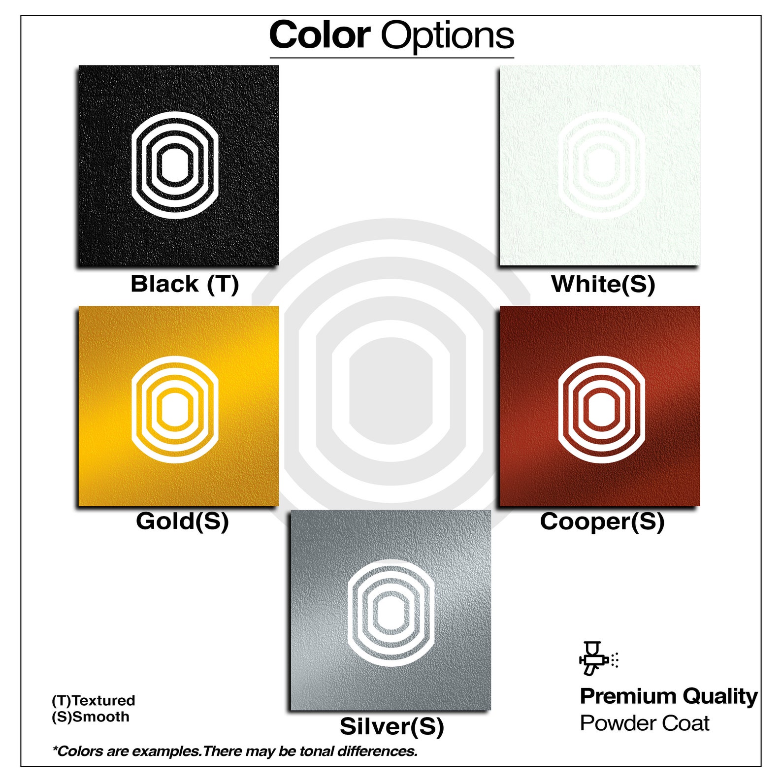 Textured, painted black, silver or gold).