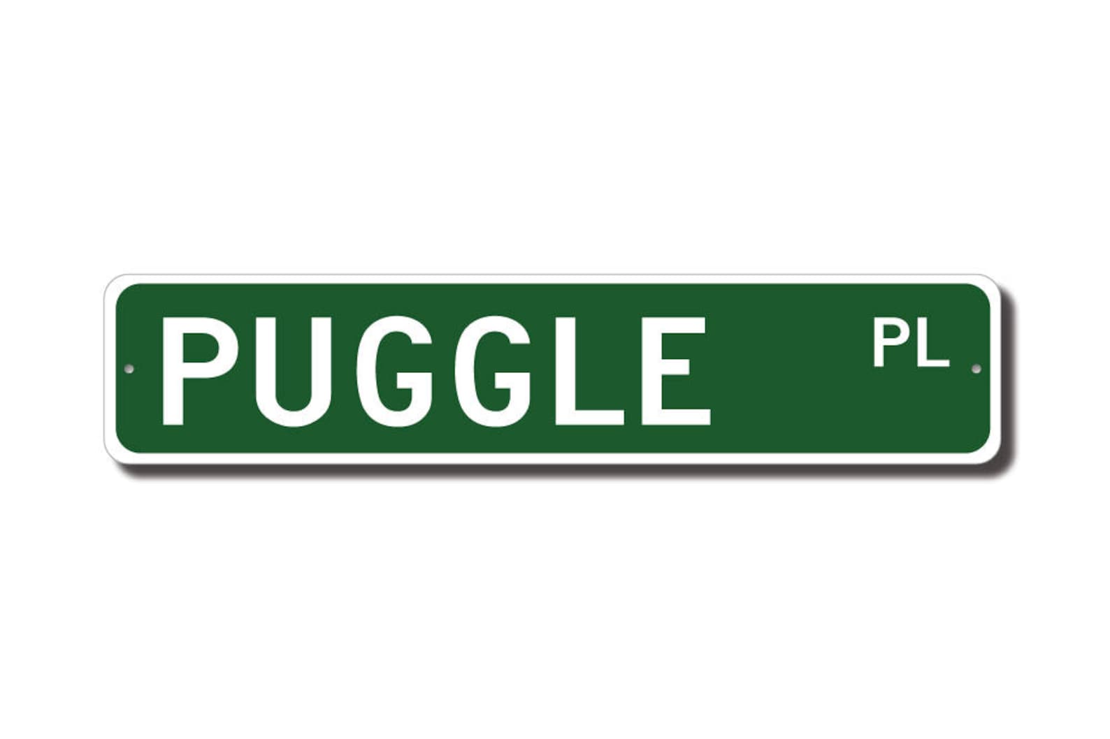 Puggle lovers check out this awesome street sign! This will make the perfect piece for any Puggle lover or Puggle cave. Made of premium aluminum it will stand the test of time. This sign will look great in any room, garage, barn or office! Get this sign for your favorite friend that loves a Puggle!