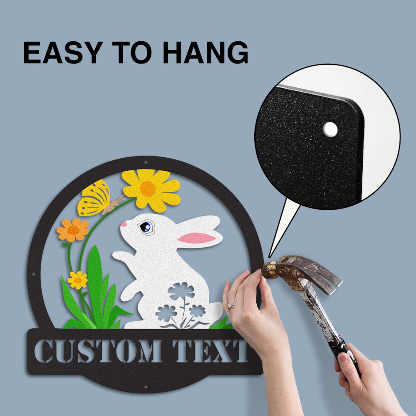 asy to hang — There are holes for you to hang metal signs. You just need to find a suitable place and position it with a hammer. The design of two or more holes can make the name sign more stable, dont worry about it falling or something. The nut can hide the screw without affecting its beauty.