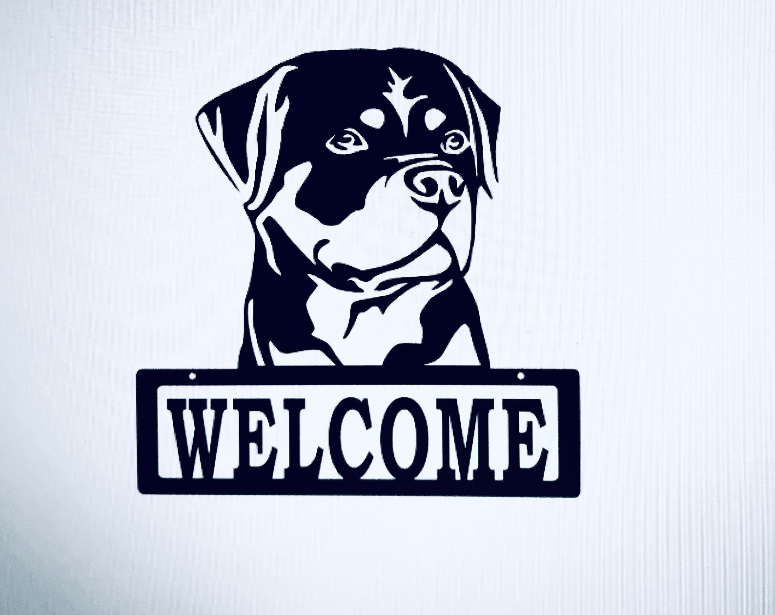 Rottweiler Dog on Premises Metal Sign or Welcome Metal Sign. CNC plasma cut from 16 gauge steel and powdercoated black to withstand the outdoor elements. We personally make each sign, they are not mass produced.