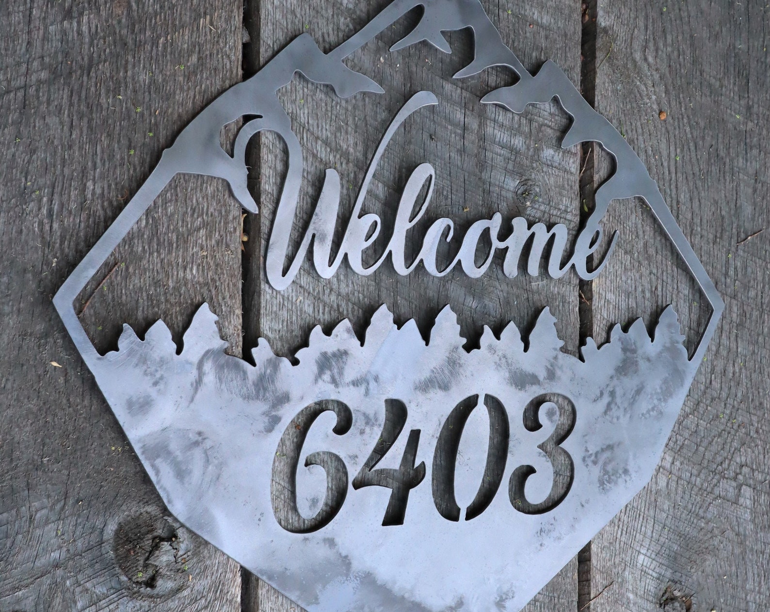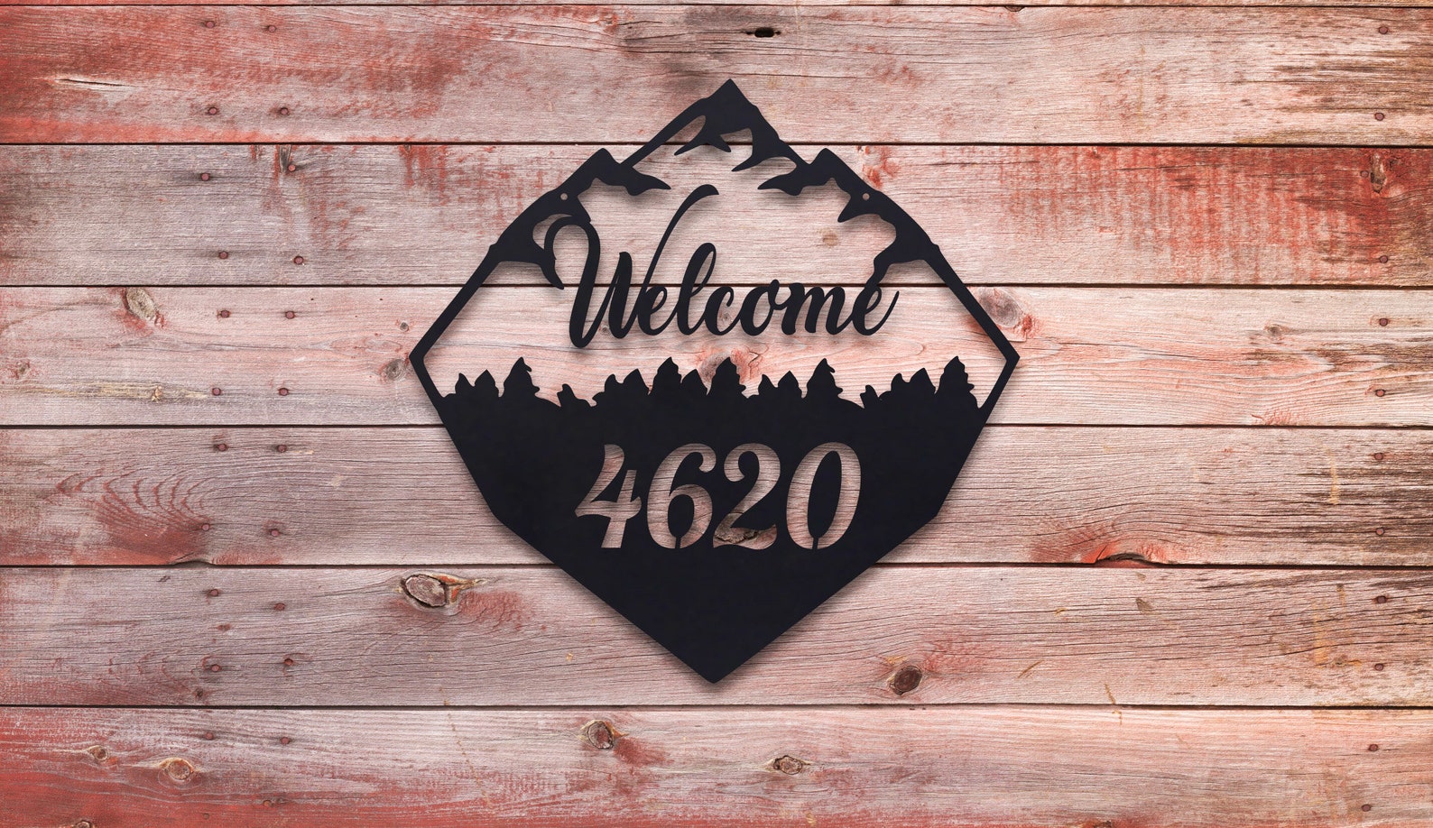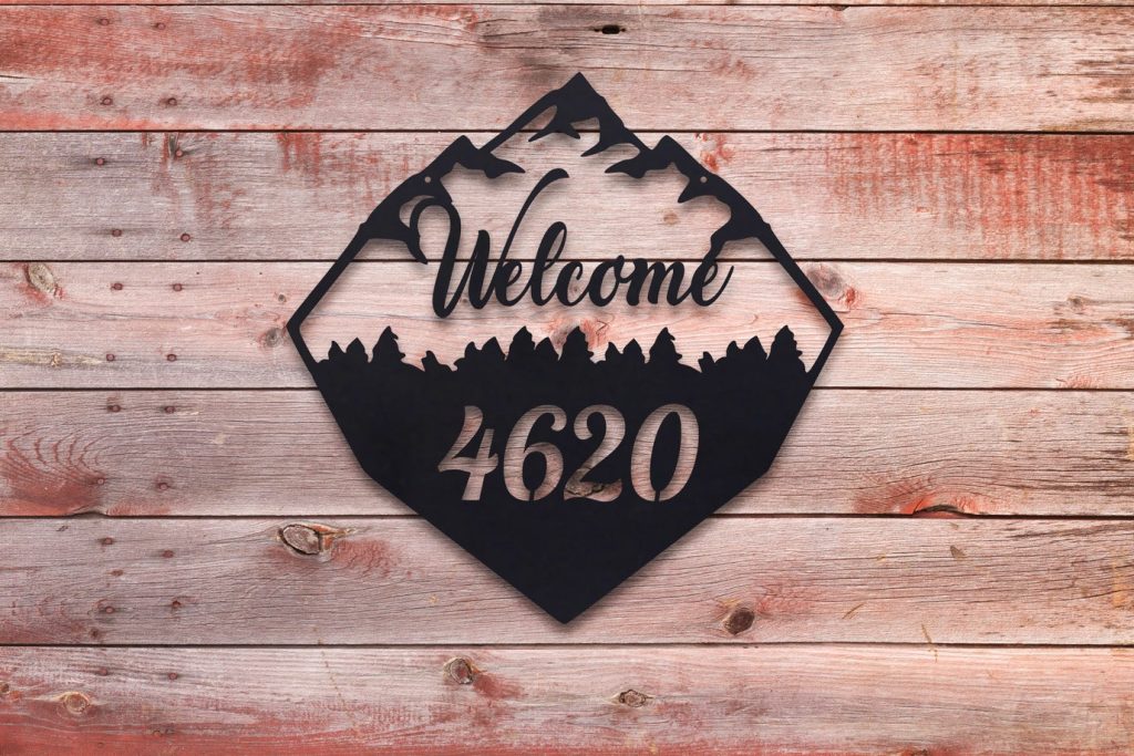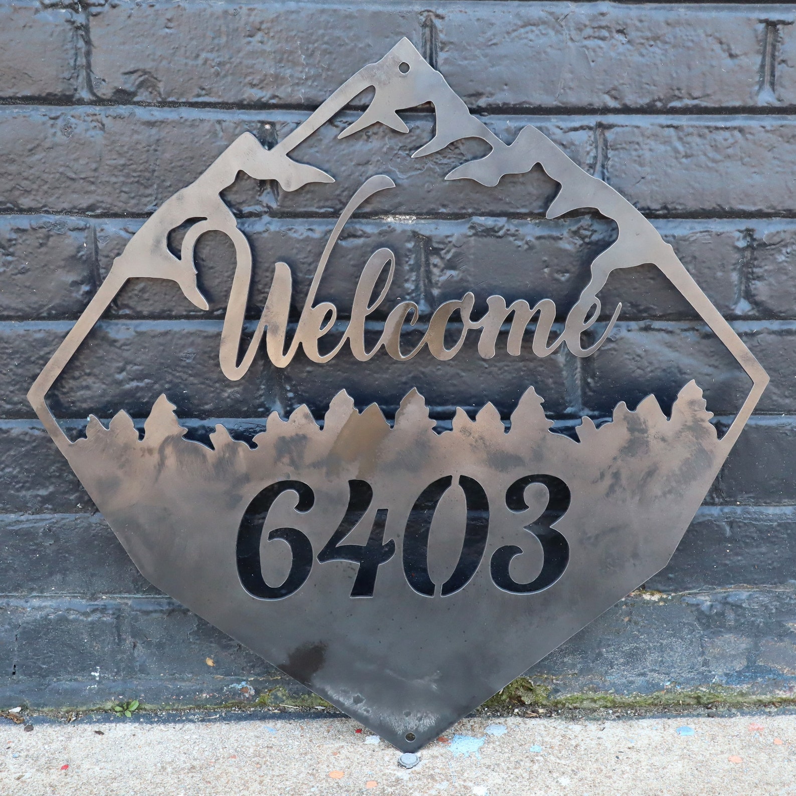 Use this rustic welcome sign to display your house number in a scene of majestic mountains and lush woods. This metal address sign has a sophisticated look with a rustic feel that will add character and charm to any home.