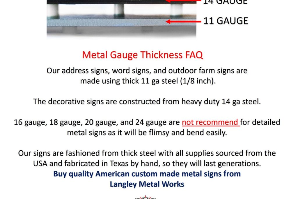 Signs are cut from our 14 ga steel and professionally powder coated black to withstand the outdoor elements.