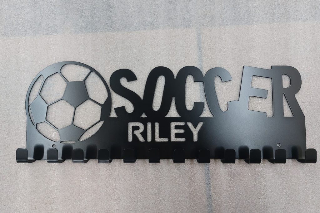 Display your favorite athletes medals with this customizable soccer medal holder. It is cut from heavy duty 16-gauge steel, so it wont be weighed down with all their awards! This product comes with 12 medal hooks with 2 mounting holes 16" on center for secure mounting. Select the paint color that best matches your athlete9;s personality. If you do not see your preferred color available, message me.