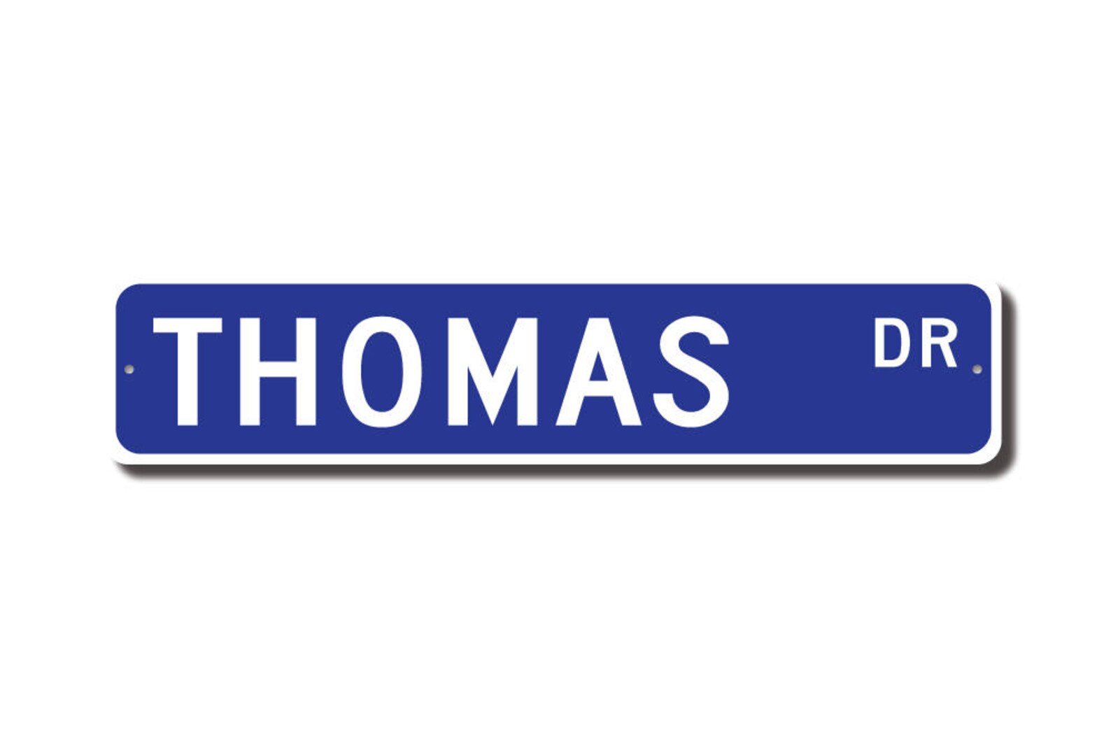 Thomas lovers check out this awesome street sign! This will make the perfect piece for any Thomas fan, or maybe you are a Thomas looking for a cool decor piece ! Made of premium aluminum it will stand the test of time. This sign will look great in any room, home den, cave, or office ! Parents or Grandparents get this sign for your favorite Thomas !