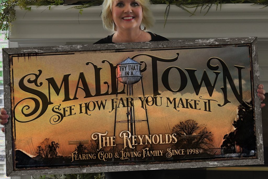 This personalized Small Town Sign offers a warm/distressed look and feel. I will customize this Try That in a Small Town sign by integrating your custom text into the vintage art you see. This makes a great gift for that special person or even yourself. Display this vintage small town sign anywhere in your home. It adds warmth to any wall.