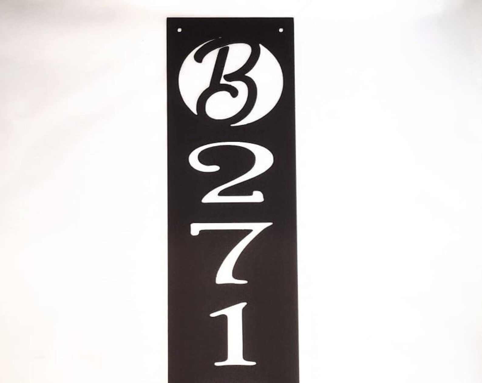 This listing is for a vertical address number sign with a monogram letter made from 16g steel and plasma cut.