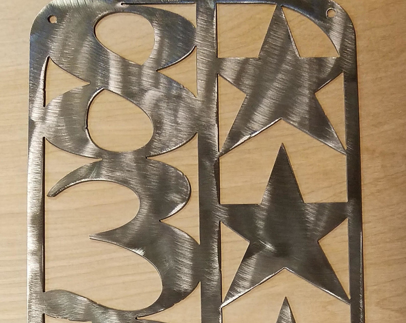 Custom designed American Flag inspired vertical metal address plate. Plasma cut from 16 gauge cold rolled steel and added holes for mounting on house or fence, screws not incl. Choose from heat blued with clear coat, shined metal with clear coat, white, black, bronze. All items are powder coated giving them lasting uv protection and durability.