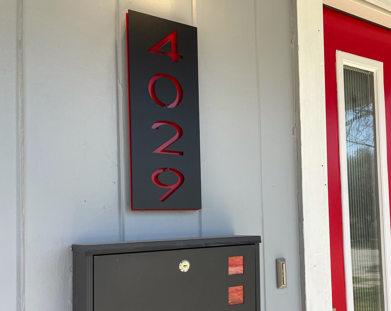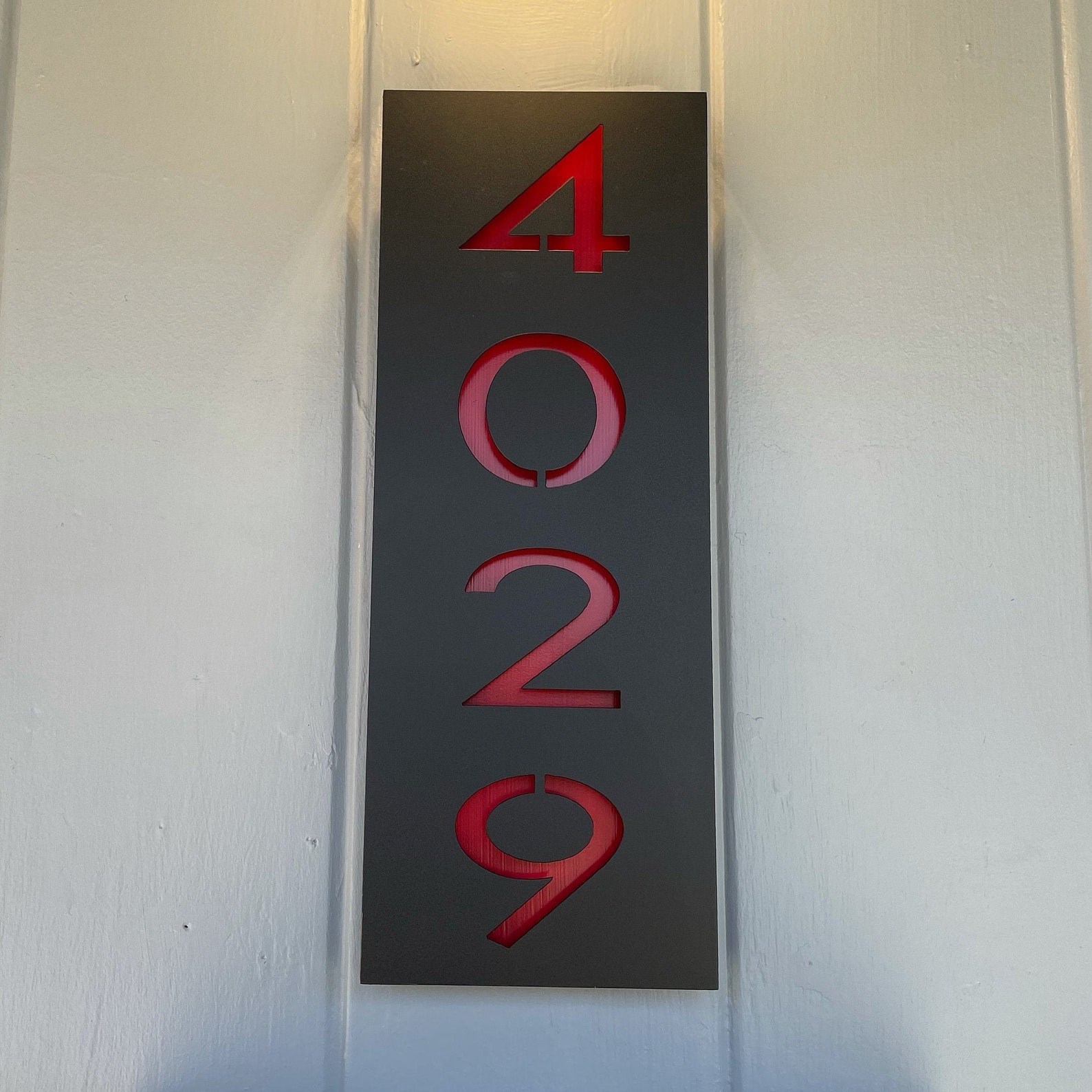 Metal Address Sign / Vertical Address Sign / Metal Address Plaque / Number Sign / Outdoor Sign / House Number Sign. This comes as a 16 inch by 6 inch sign. The front layer is attached to the back layer using neodymium magnets. The back layer must be attached to the wall before the front layer is placed onto the back layer. Please select options for both the color and option to add background color to the numbers. If you have any questions, please do not hesitate to message us.