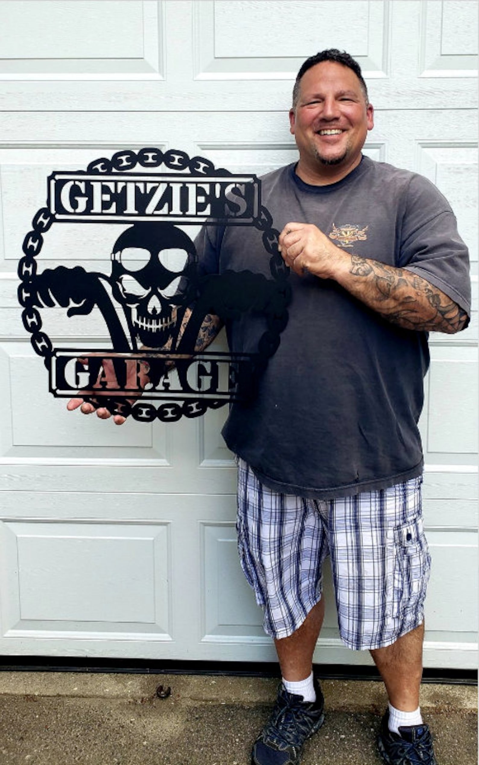 Sweet Ride9;s laser-cut Biker Skull Personalized Garage Sign is the perfect addition to your man cave or garage