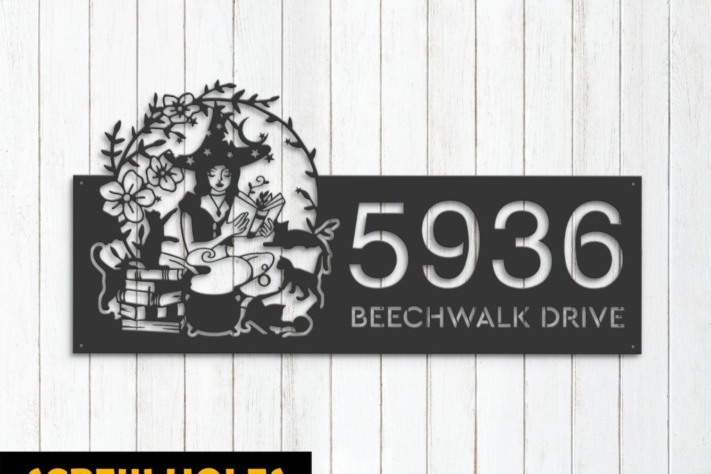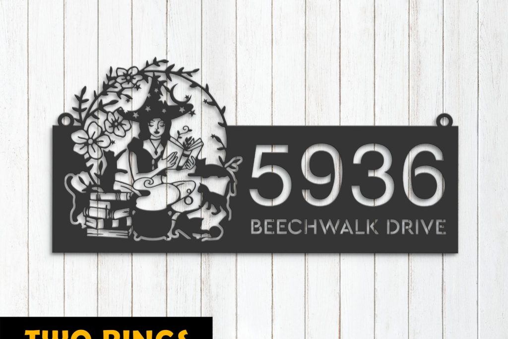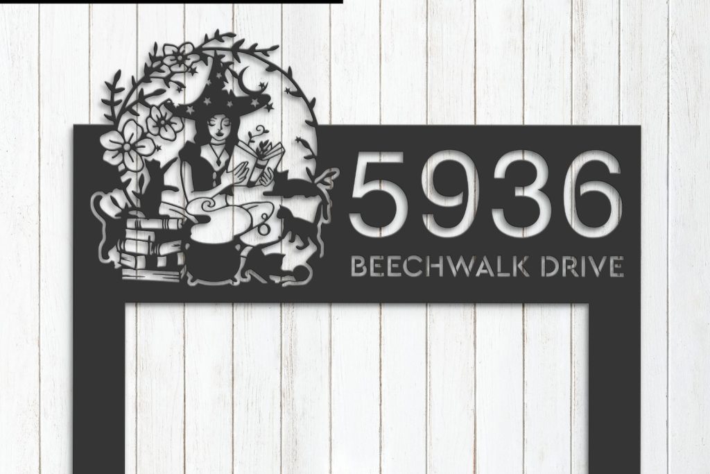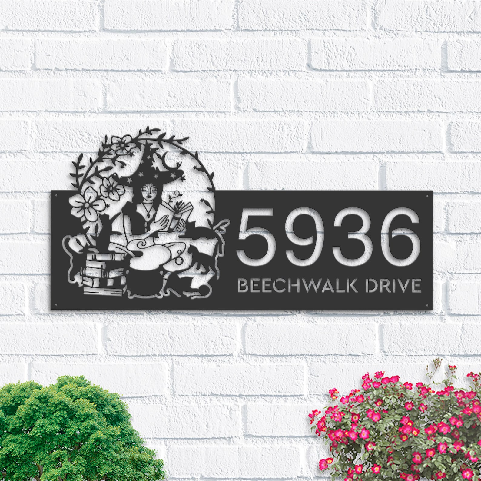 Witch and Cat Address Sign – Personal Metal Halloween Plaque