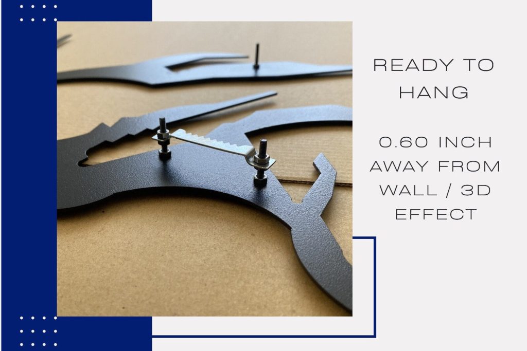 Material : Crafted from durable 2 mm steel, coated in a textured black static paint boasting a smooth matte finish. The item, designed with a captivating 3D shadow effect, extends 0.60 inches from the wall. Its robust construction allows it to withstand moisture-rich surroundings, making it suitable for areas like kitchens, bathrooms, and even outdoor spaces.